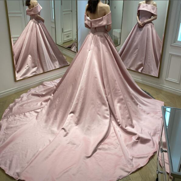 美品!ロールカラー 薄ピンク カラードレス Aラインドレス 二次会ドレス オフショルダー ロングトレーン パーティードレス【色変更可能】
