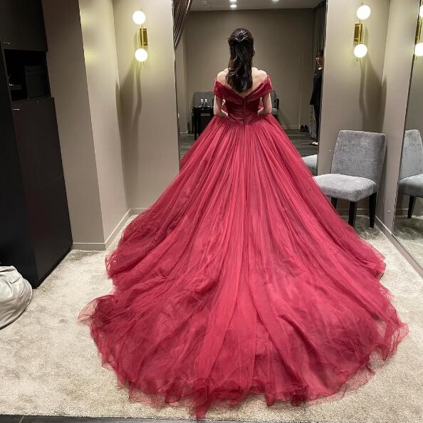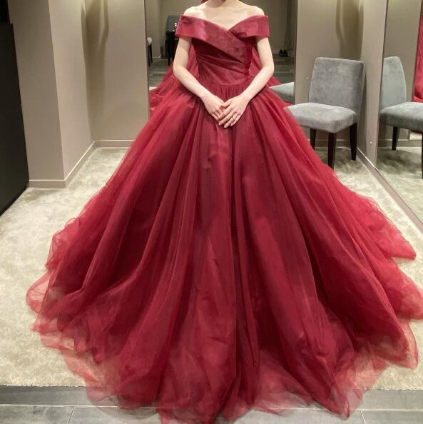 美品!ワイレッド サッシュベルト カラードレス 柔らかいチュールドレス 二次会ドレス/前撮り オフショルダー ロングトレーン パーティードレス【色変更可能】