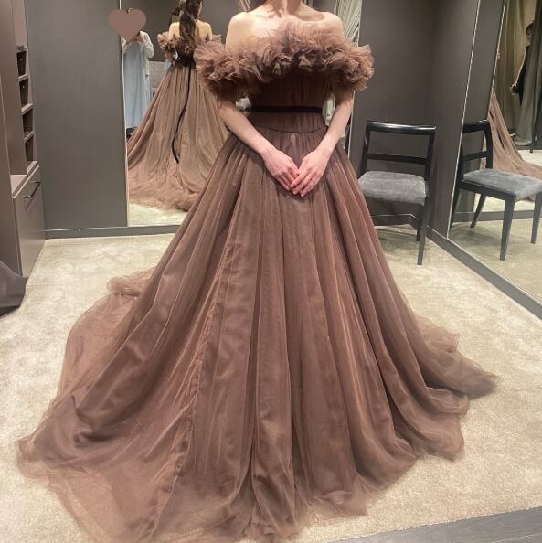 美品!コーヒーブラウン ウエストリボン カラードレス 柔らかいチュールドレス 二次会ドレス/前撮り フリルオフショルダー パーティードレス【色変更可能】 | David1021k Dress(ダヴィドレス)