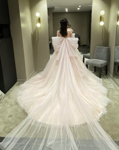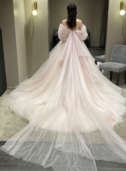 美品!フェミニン 薄シャンパン色 カラードレス キラキラグリッターチュール オフショルスリーブ 二次会ドレス/前撮り パーティードレス【色変更可能】