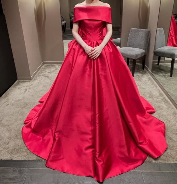 美品!レッド/赤 カラードレス Aラインドレス ショッキングピンク 二次会ドレス ロールカラー ロングトレーン パーティードレス【色変更可能】