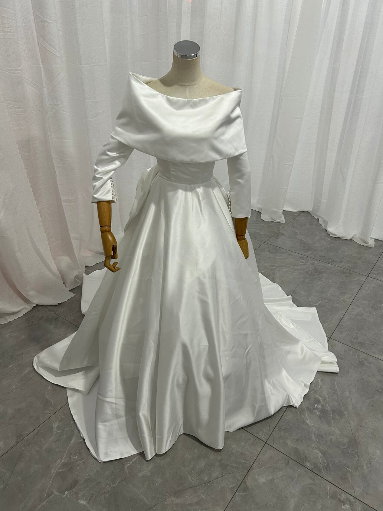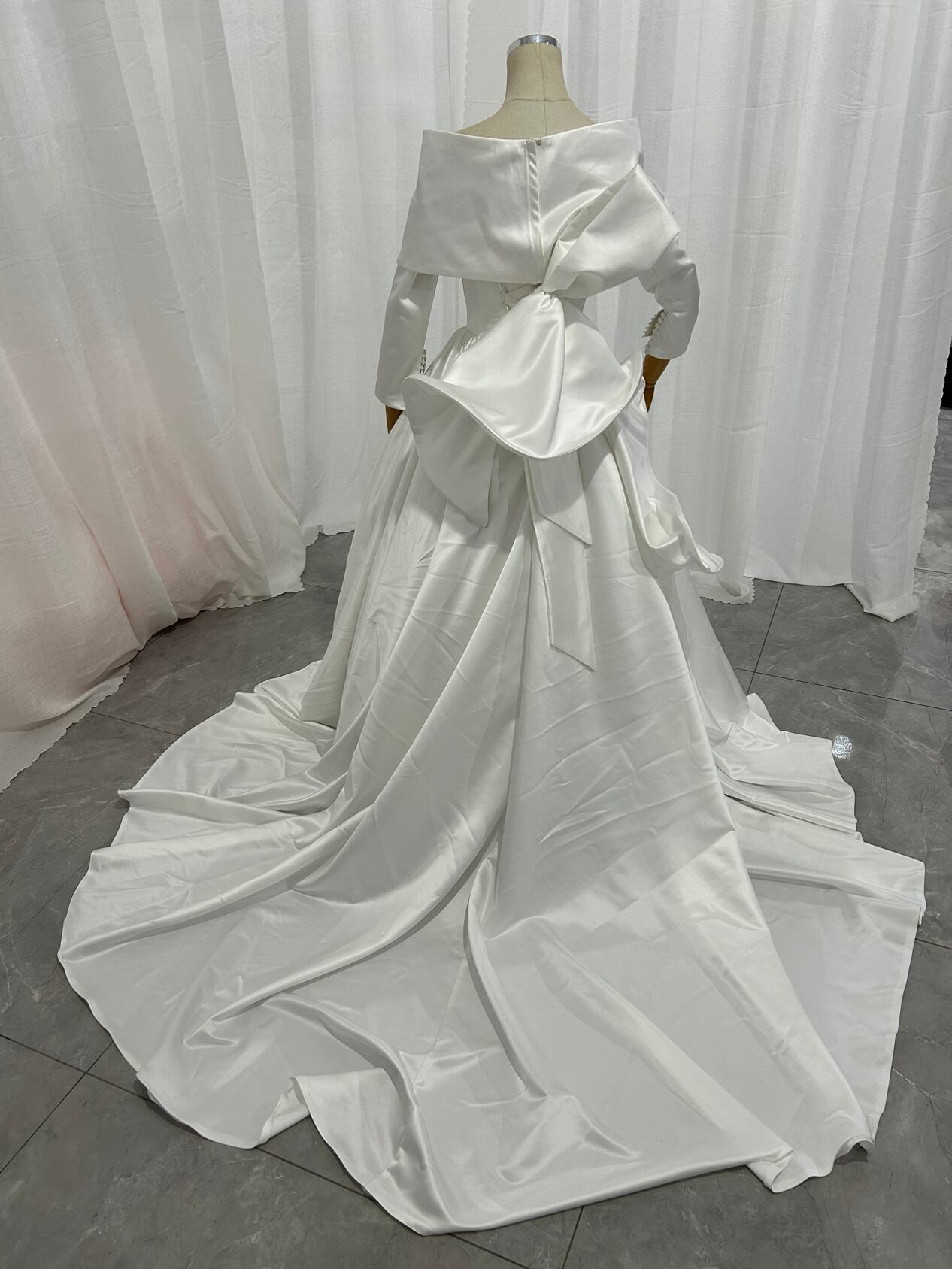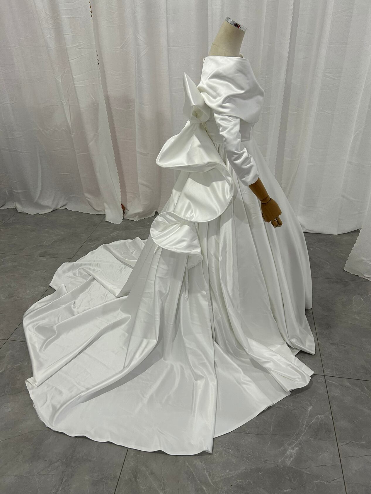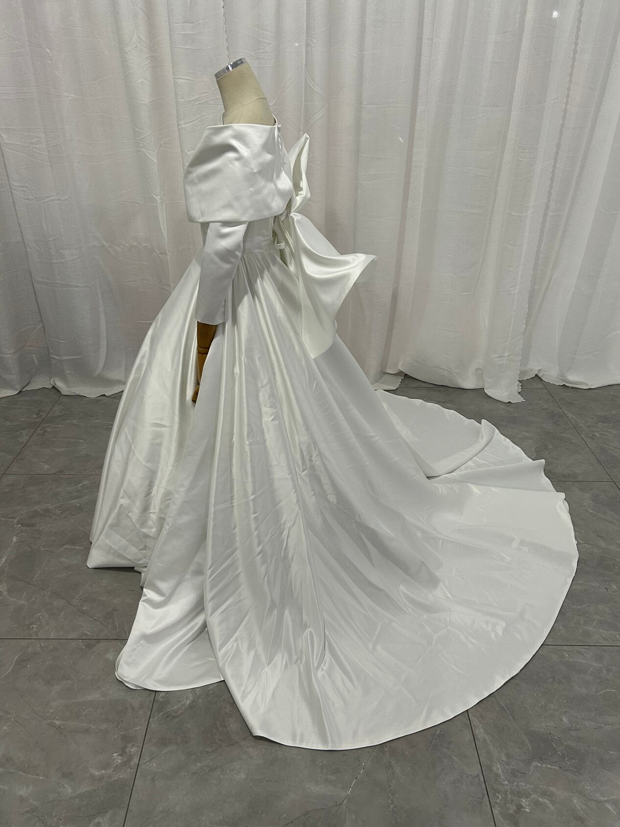 上品 ベアトップ ウエディングドレス ふっくら柔らかなバックリボン 華やかなトレーン+オフショルダー 長袖 トップス 前撮り/花嫁/結婚式