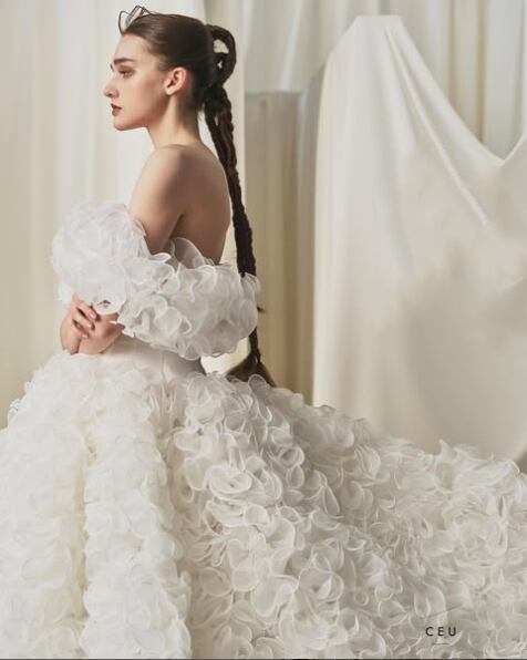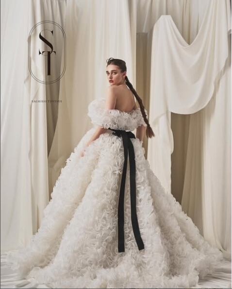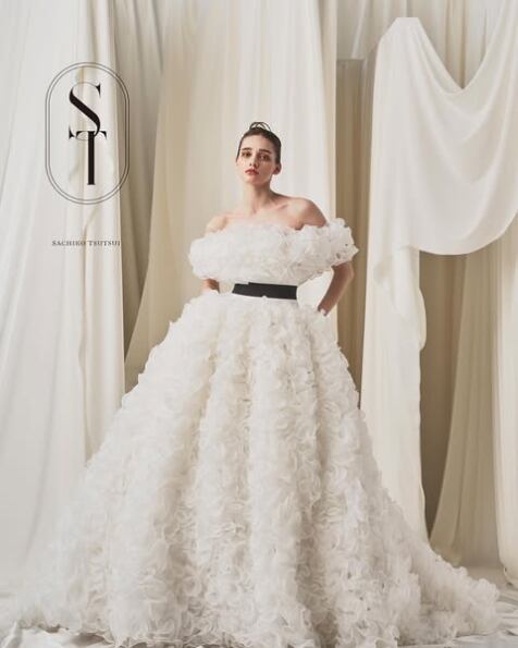 美品!フリルオフショルダー ウエディングドレス 韓国風ドレス ラッフルフリルドレス パーティードレス ボリュームドレス【色変更可能】