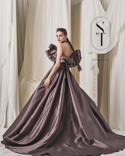 高品質!ベアトップ フリル ブラウン カラードレス Aラインドレス 光沢サテン イブニングドレス 前撮り パーティードレス【色変更可能】