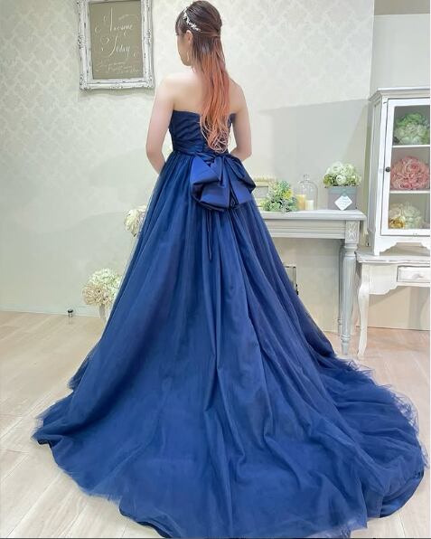 美品!フェミニン ネイビーブルー カラードレス バックリボン Aラインドレス 二次会ドレス/前撮り パーティードレス【色変更可能】