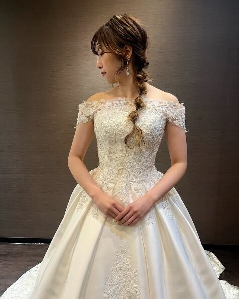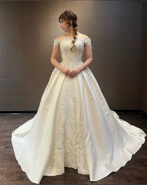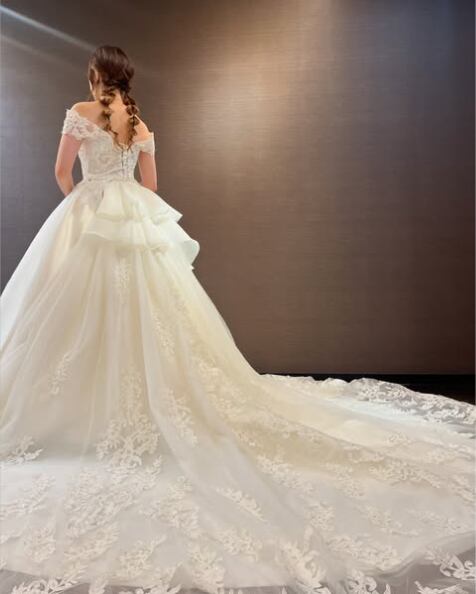 高品質!オフショルダー ウエディングドレス 上品レース 総レーストレーン バックリボン イブニングドレス 前撮り パーティードレス