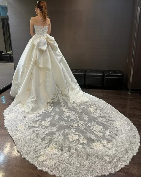 高品質!バックリボン ウエディングドレス 上品レース 花モチーフ刺繡 取り外し可能なトレーン イブニングドレス 前撮り パーティードレス