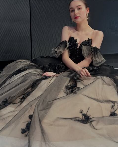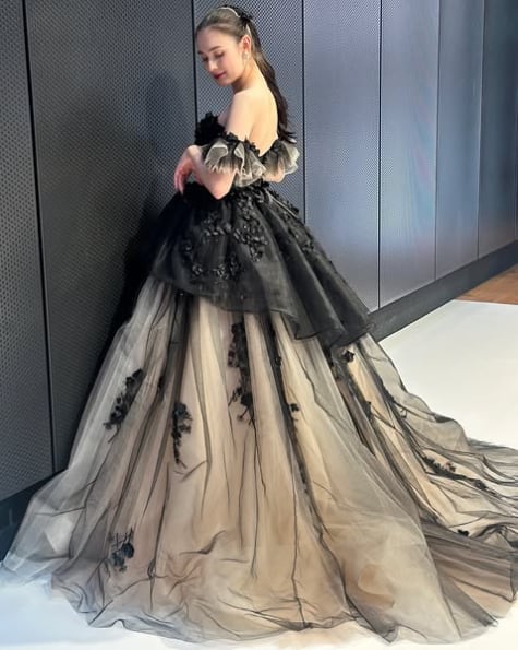 美品!フェミニン ブラック/黒 付け袖 カラードレス チュールドレス 花モチーフ刺繡 二次会ドレス/前撮り パーティードレス【色変更可能】