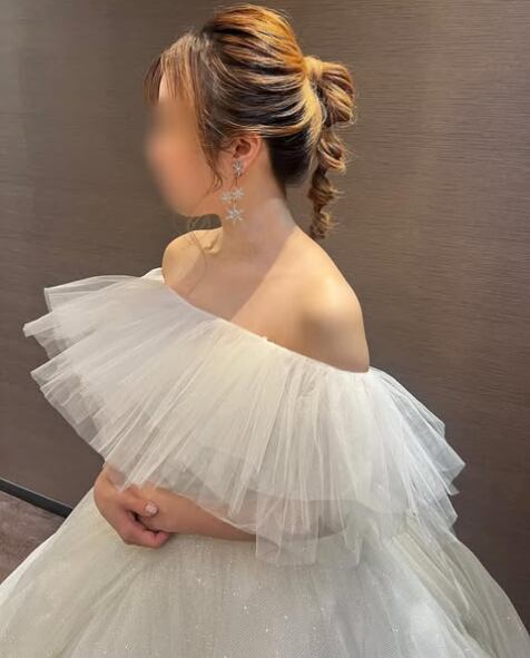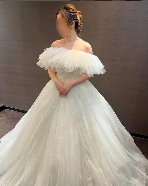 高品質!ロールカラー ウエディングドレス チュールオフショルダー キラキラグリッターチュール イブニングドレス 前撮り パーティードレス