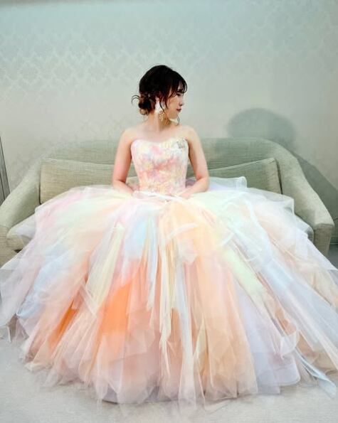 美品!フェミニン オレンジ色 ベアトップビスチェ カラードレス グラデーション ラッフルフリル 二次会ドレス/前撮り パーティードレス【色変更可能】