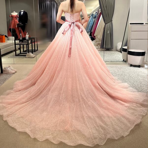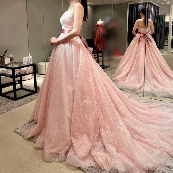 美品!フェミニン コーラルピンク ベアトップビスチェ カラードレス キラキラグリッターチュール 二次会ドレス/前撮り パーティードレス【色変更可能】 | David1021k Dress(ダヴィドレス)