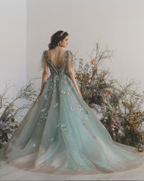 美品!フェミニン ライトスカイブルー 半袖 vネック カラードレス 繊細レース 花モチーフ刺繡 二次会ドレス/前撮り パーティードレス【色変更可能】