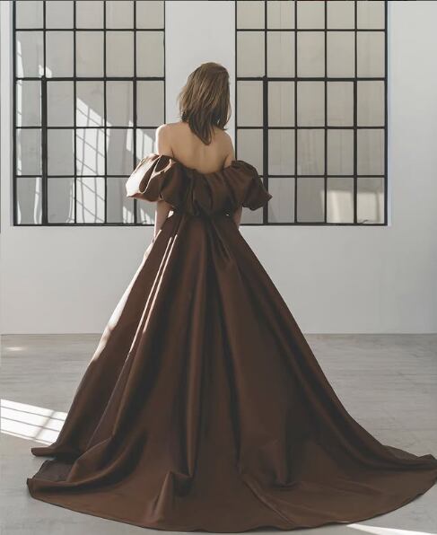 美品!チョコレートブラウン カラードレス Aラインドレス ふわふわオフショルダー 二次会ドレス ロングトレーン イブニングドレス パーティードレス【色変更可能】
