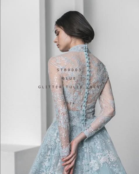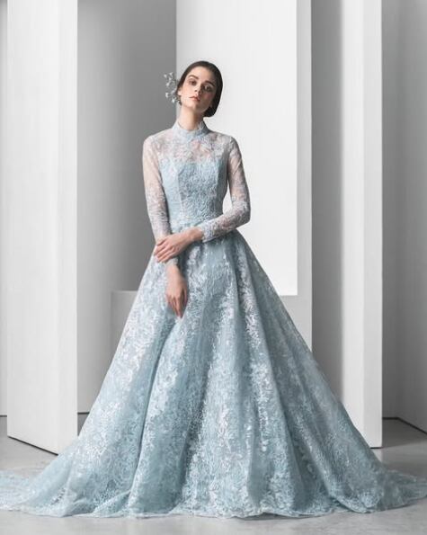 美品!フェミニン ロングスリーブ カラードレス ハイネック ミスティブルー 総レースドレス 二次会ドレス/前撮り パーティードレス【色変更可能】