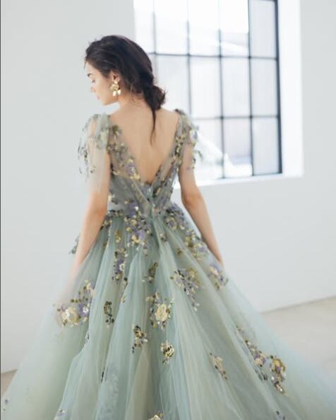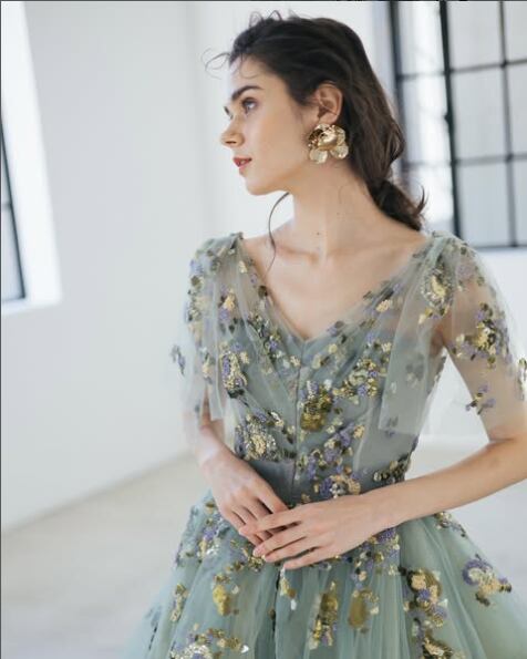 美品!フェミニン ブルーグリーン 半袖 vネック カラードレス 繊細レース 花モチーフ刺繡 二次会ドレス/前撮り パーティードレス【色変更可能】