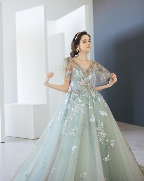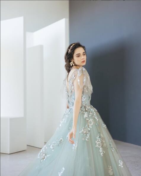 美品!フェミニン ライトスカイブルー 半袖 vネック カラードレス 繊細レース 花モチーフ刺繡 二次会ドレス/前撮り パーティードレス【色変更可能】