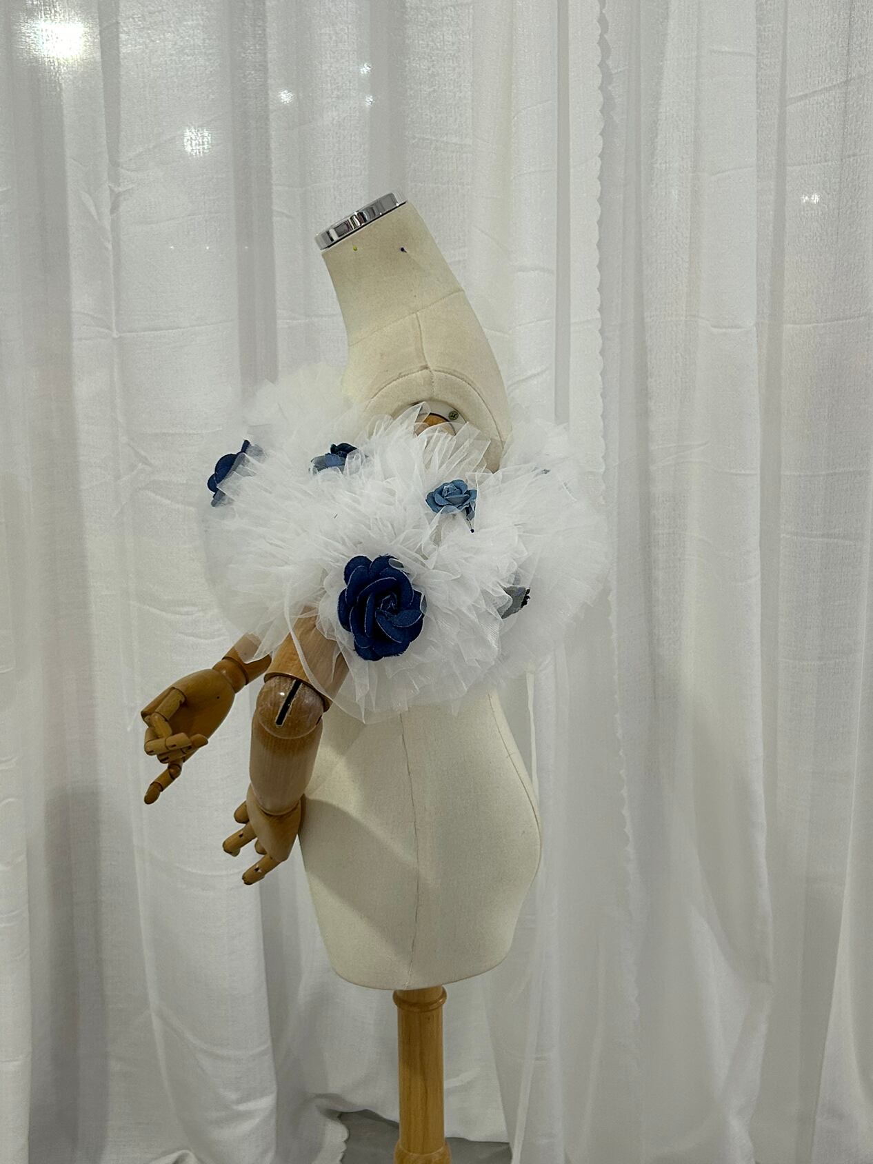青 バラ ポンチョ ソフトチュール ラッフルフリル 取り外しオフショルダー お色直し ふわふわロールカラー カラードレ