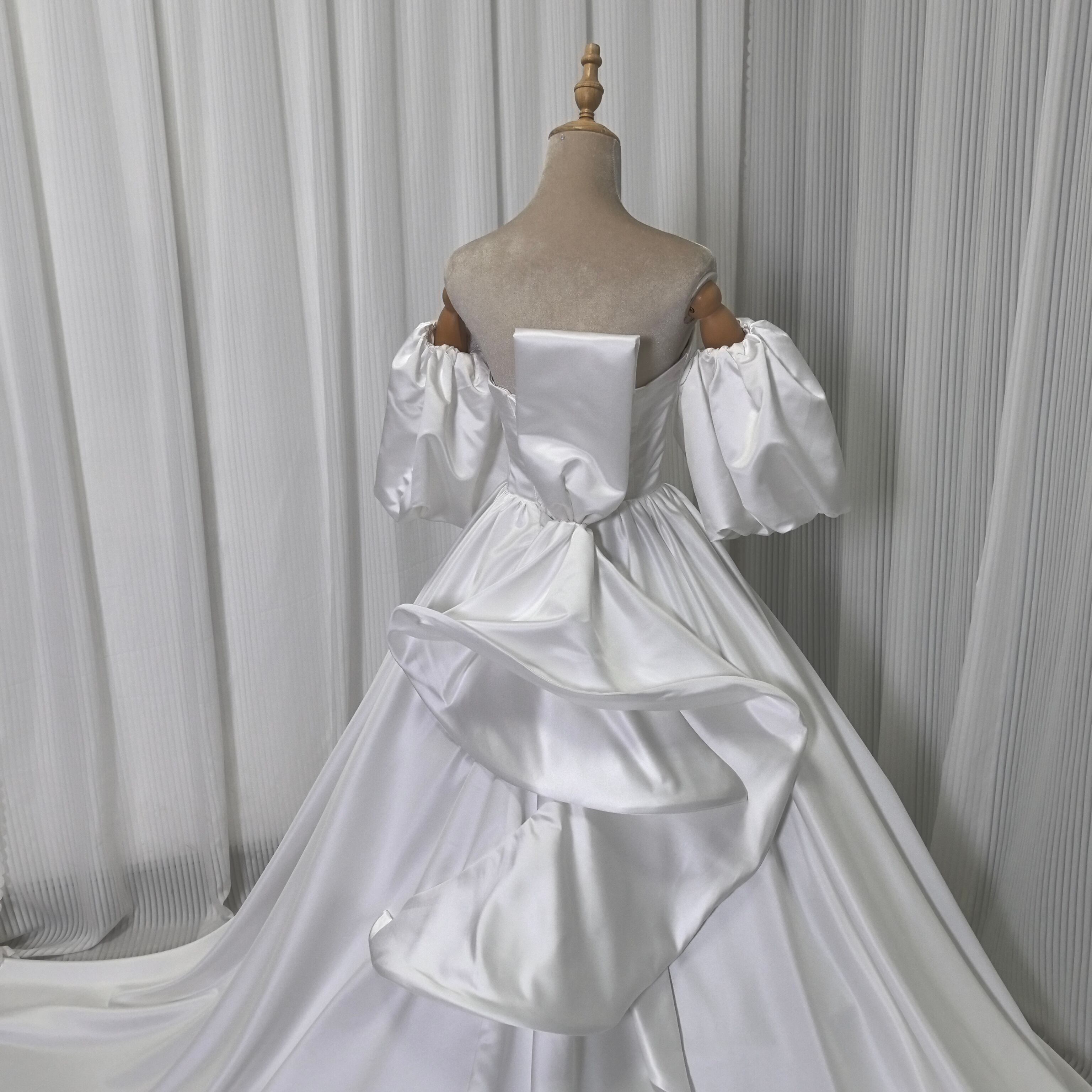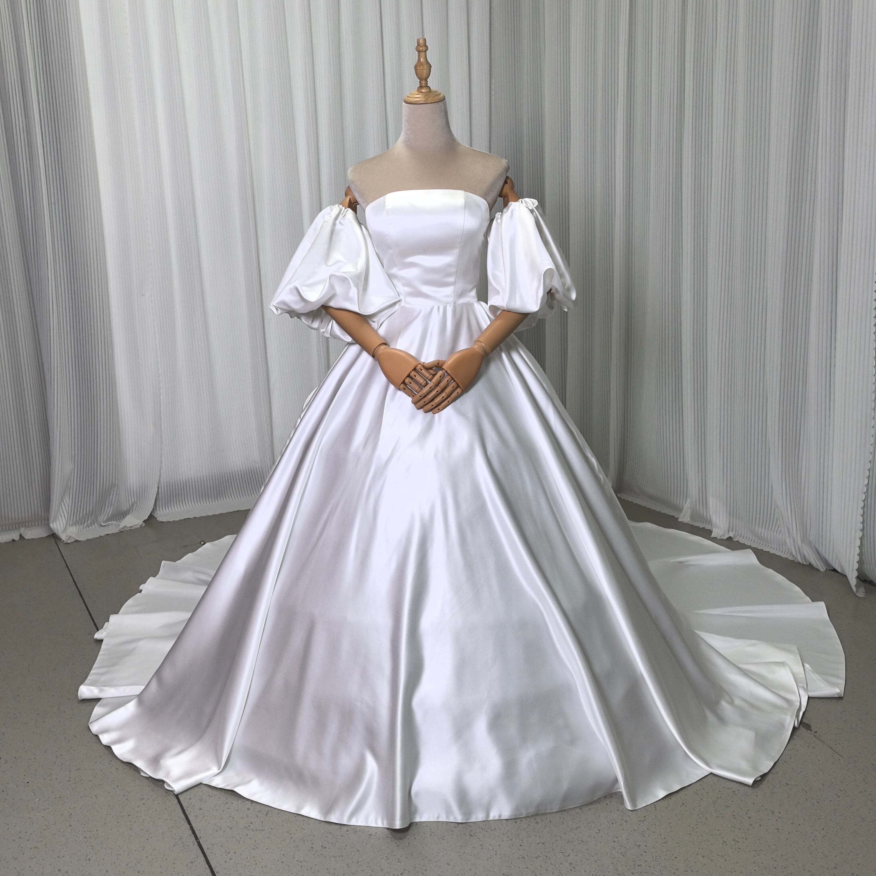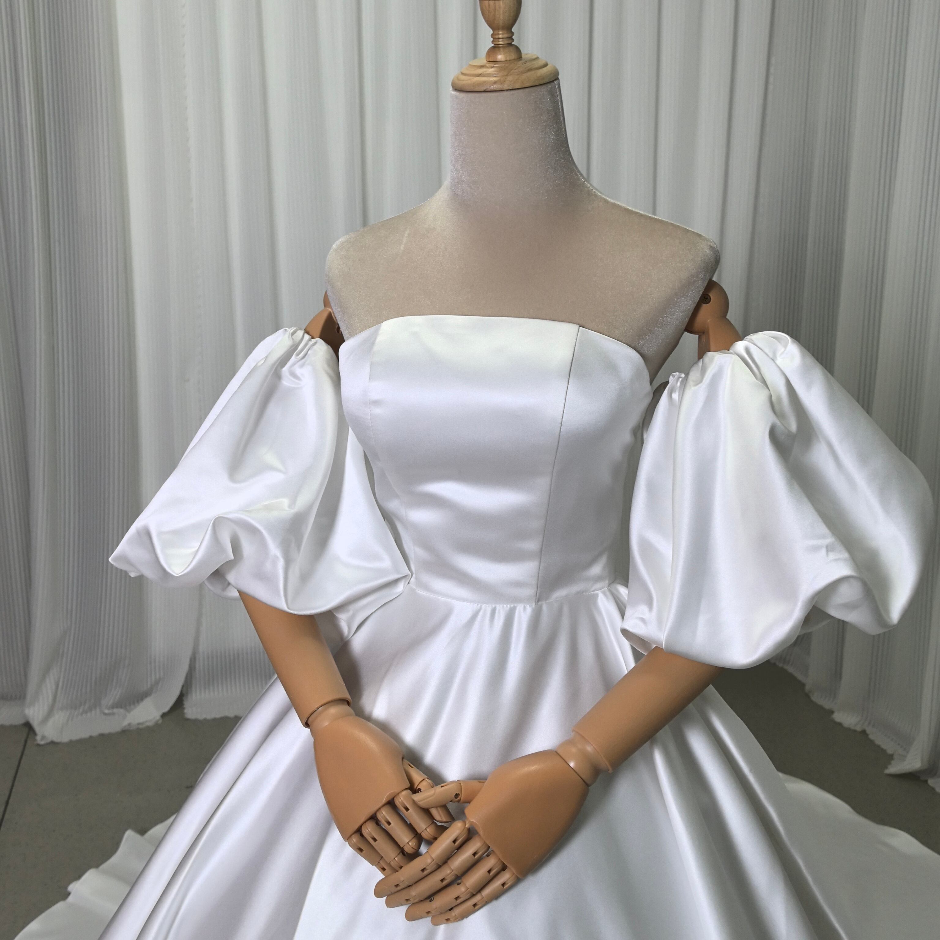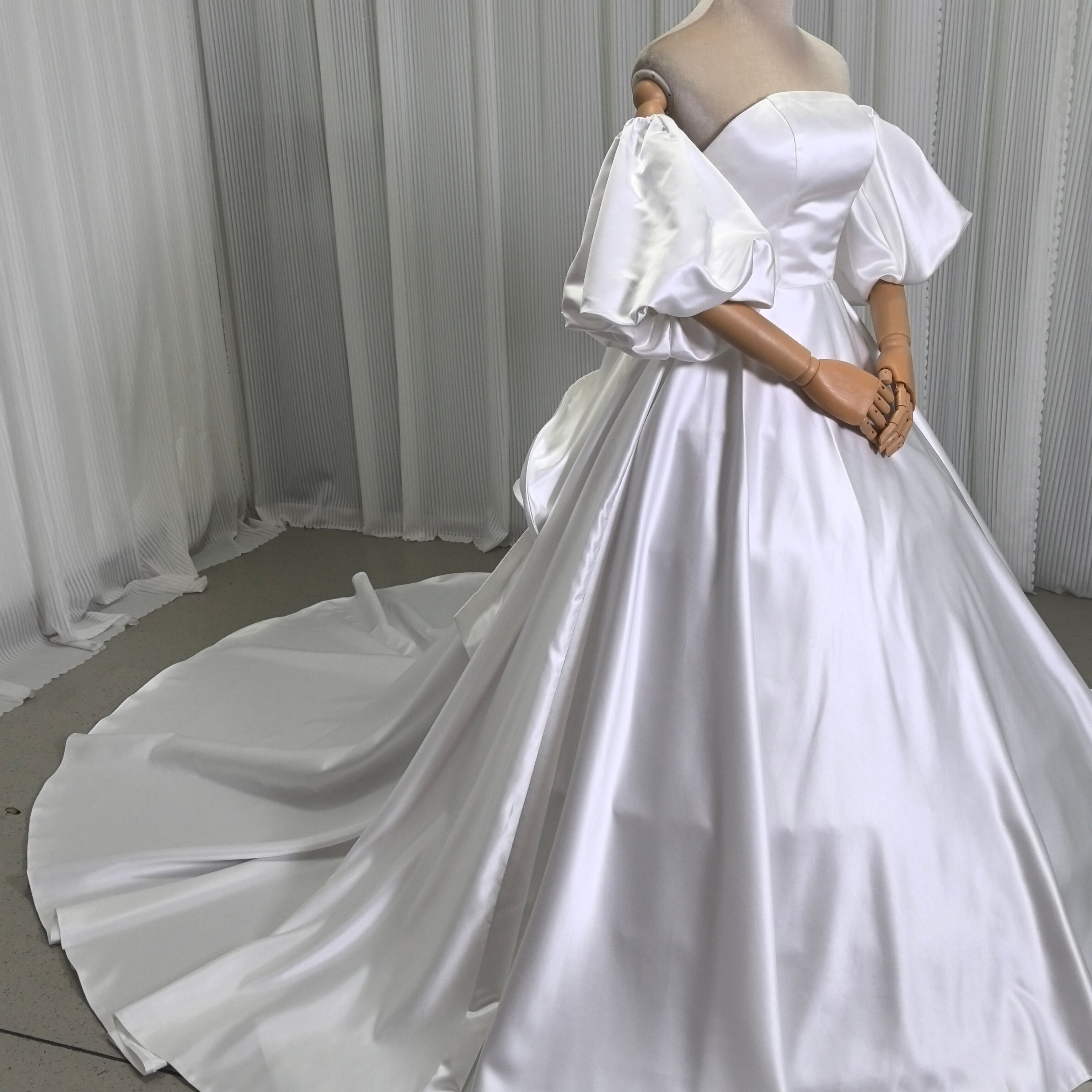 上品 ベアトップ ウエディングドレス ふっくら柔らかなバックリボン 華やかなトレーン+オフショルダー トップス