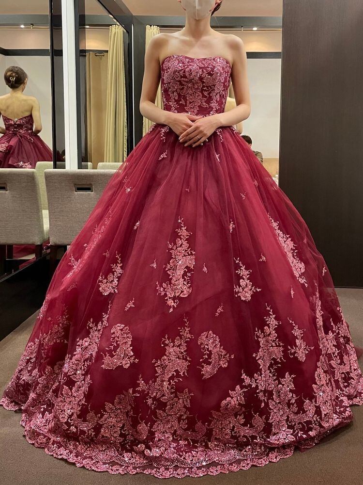 美品!カラードレス ボルドー色 ワイレッド Aラインドレス 繊細レース 花モチーフ刺繡 二次会ドレス イブニングドレス パーティードレス【色変更可能】