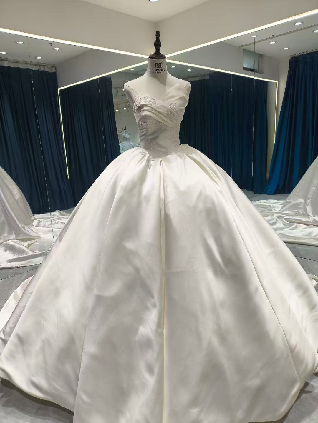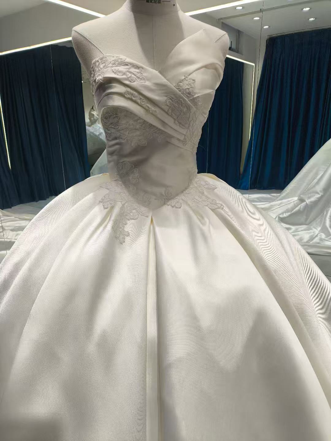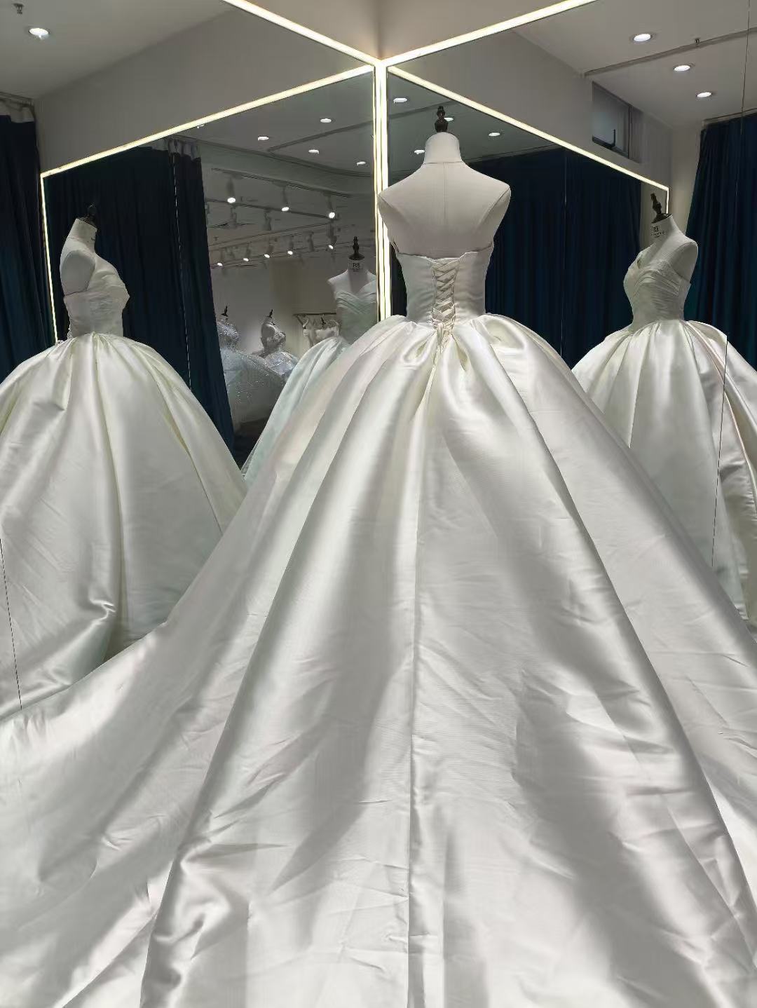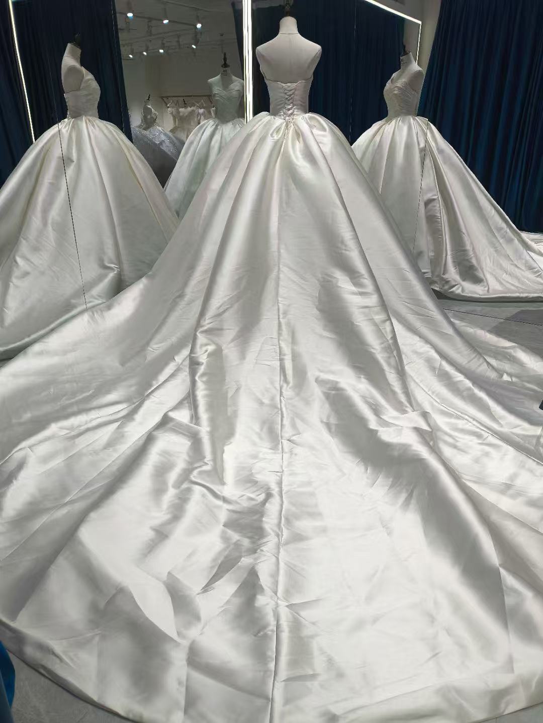 韓国風キラキラ ベアトップ ウエディングドレスロングトレーン サテンドレス パフスリーブ前撮り/花嫁/結婚式/披露宴