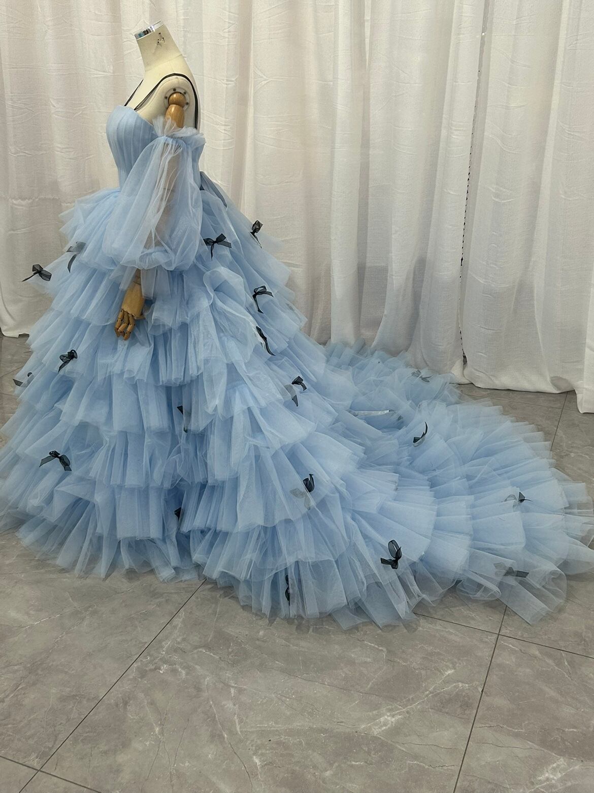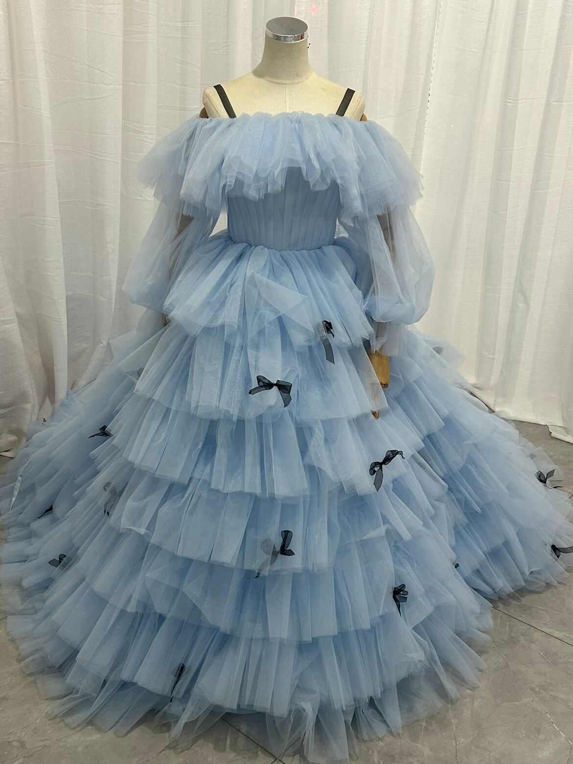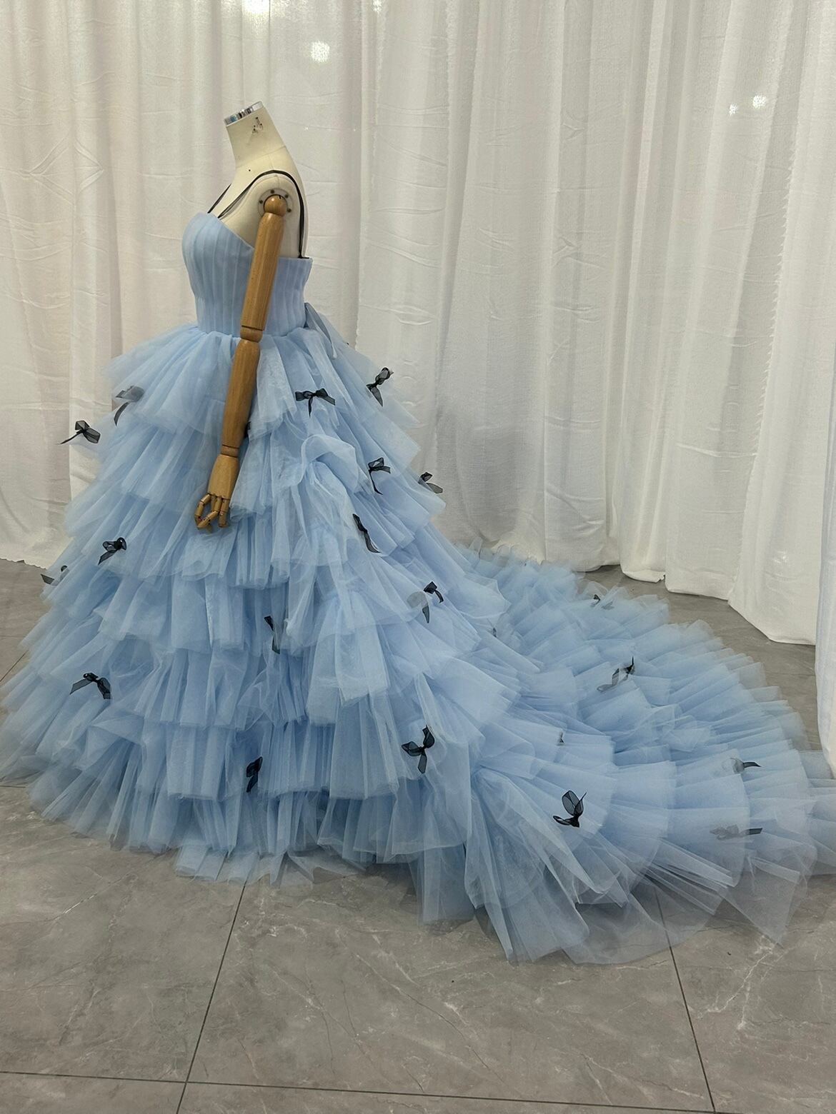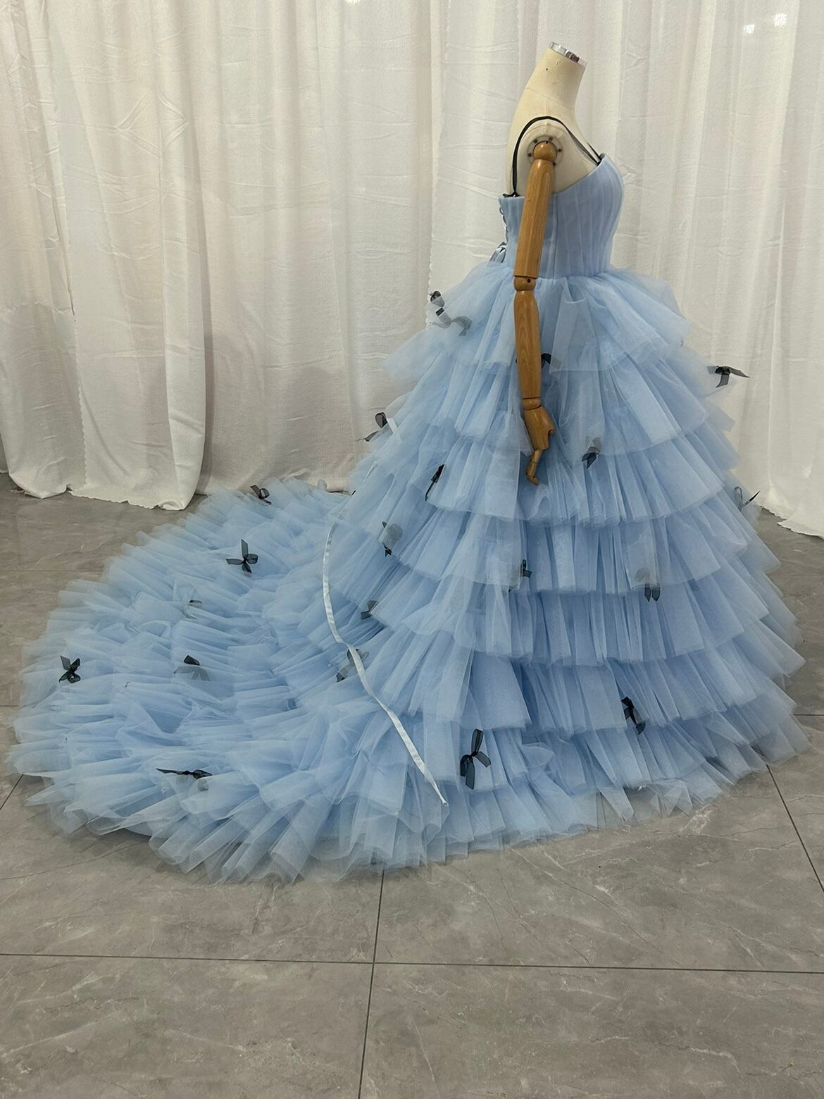 人気上昇! ライトスカイブルー リボン カラードレス ティアードのドレス 柔らかく重ねたチュールスカート 結婚式