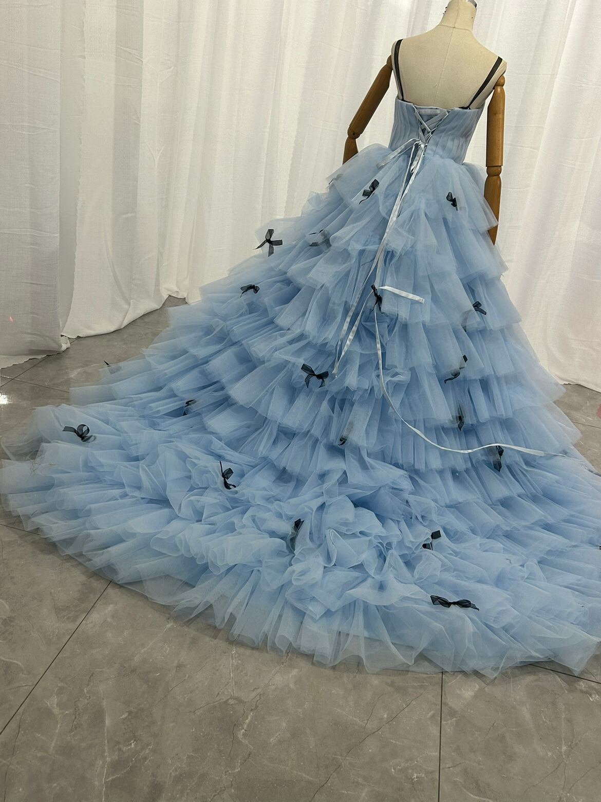 人気上昇!ベアトップ ライトスカイブルー カラードレス ティアードのドレス リボン 柔らかく重ねたチュールスカート