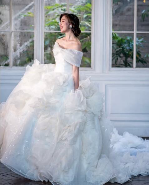 高品質!ウエディングドレス オフショルダー 3Dフラワードレス ボリュームドレス キラキラグリッターチュール イブニングドレス 前撮り パーティードレス【色変更可能】