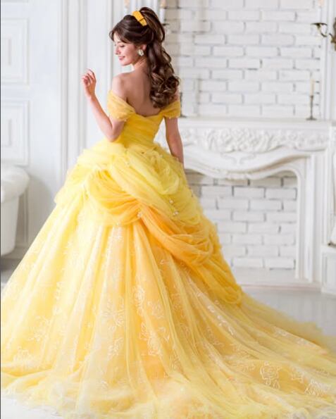高品質!カラードレス イエロー/黄色 パール オフショルダー 繊細レース 高見せ イブニングドレス 前撮り パーティードレス【色変更可能】