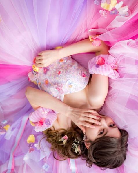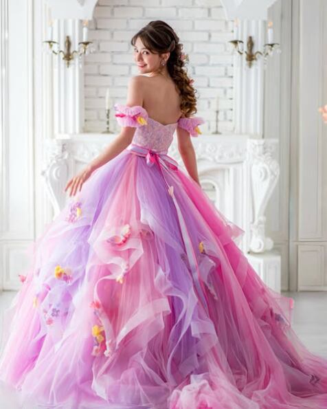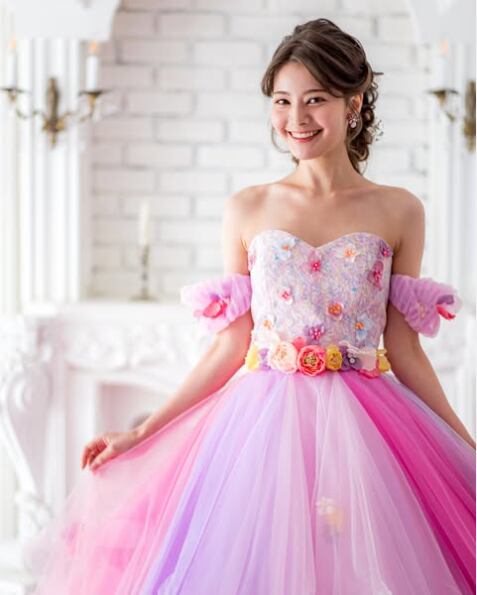 高品質!カラードレス ピンク紫 レインボードレス ラッフルフリル 3Dアップリケ 高見せ イブニングドレス 前撮り パーティードレス【色変更可能】