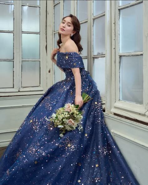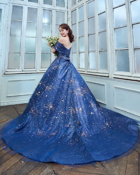 高品質!カラードレス ネイビーブルー ロールカラー プリンセスライン スパコール イブニングドレス 前撮り パーティードレス【色変更可能】