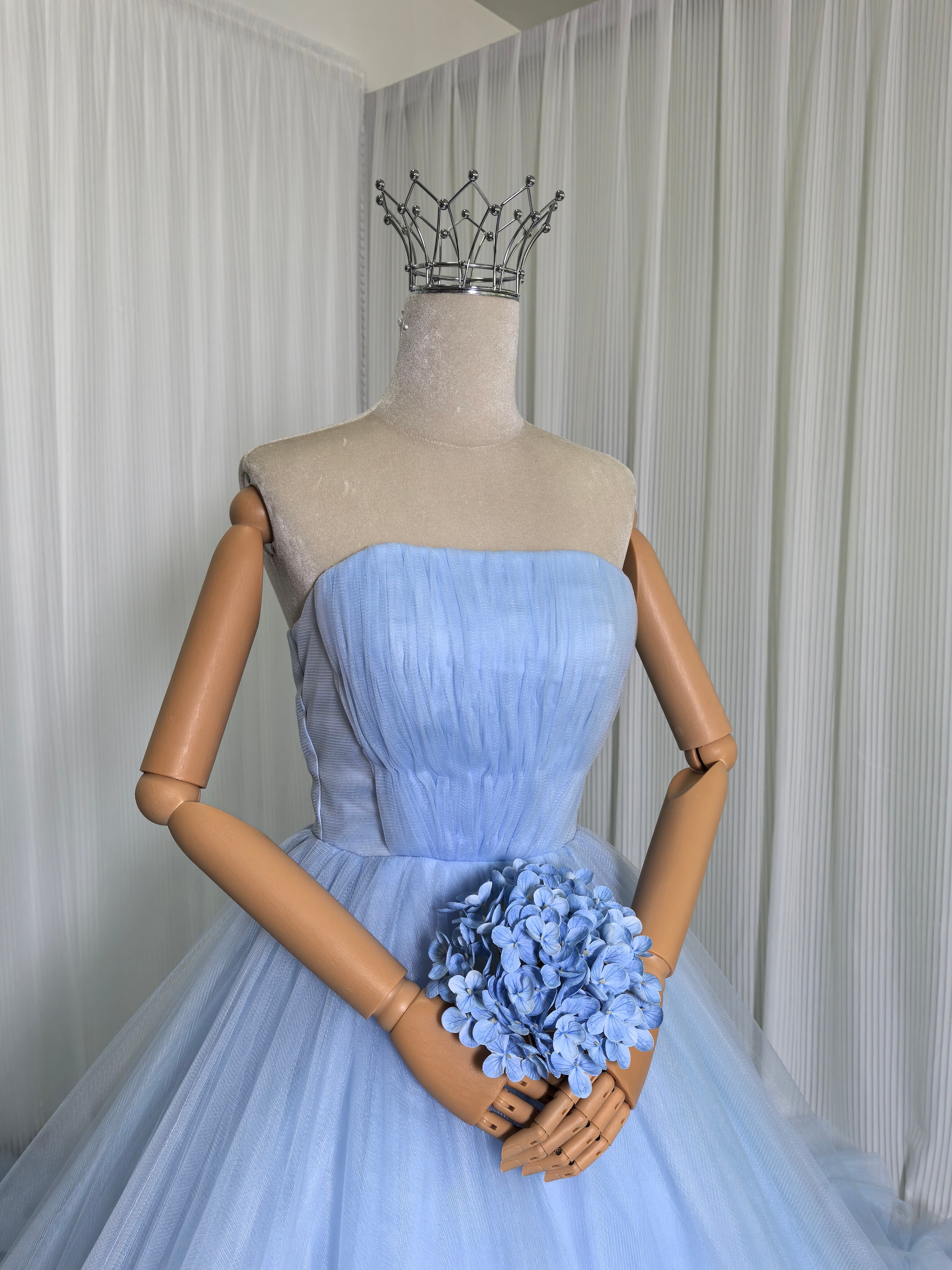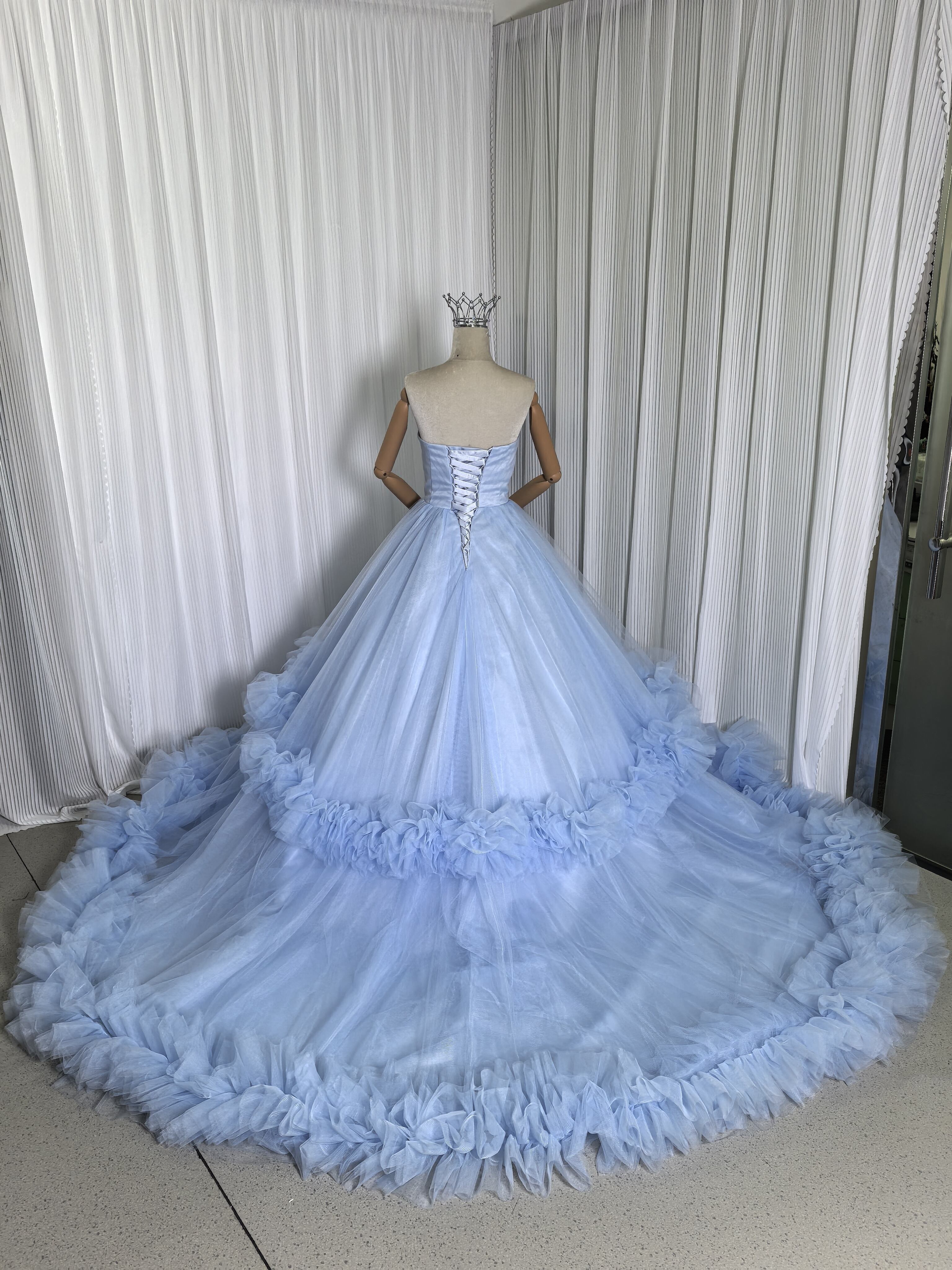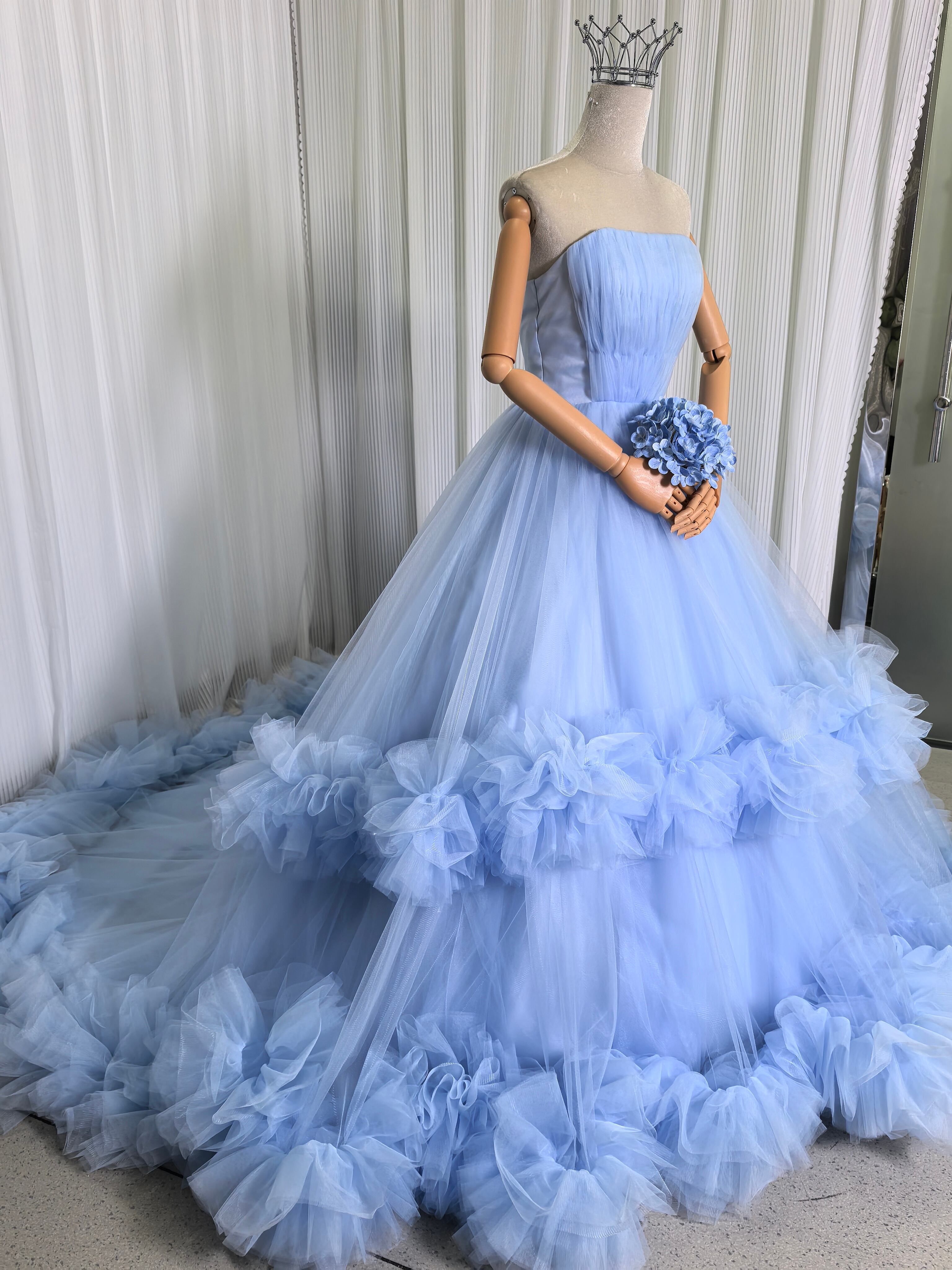 実例写真!爽やかで優しいブルー カラードレス ロールカラー プリンセスライン スパコール イブニングドレス 前撮り パーティードレス【色変更可能】