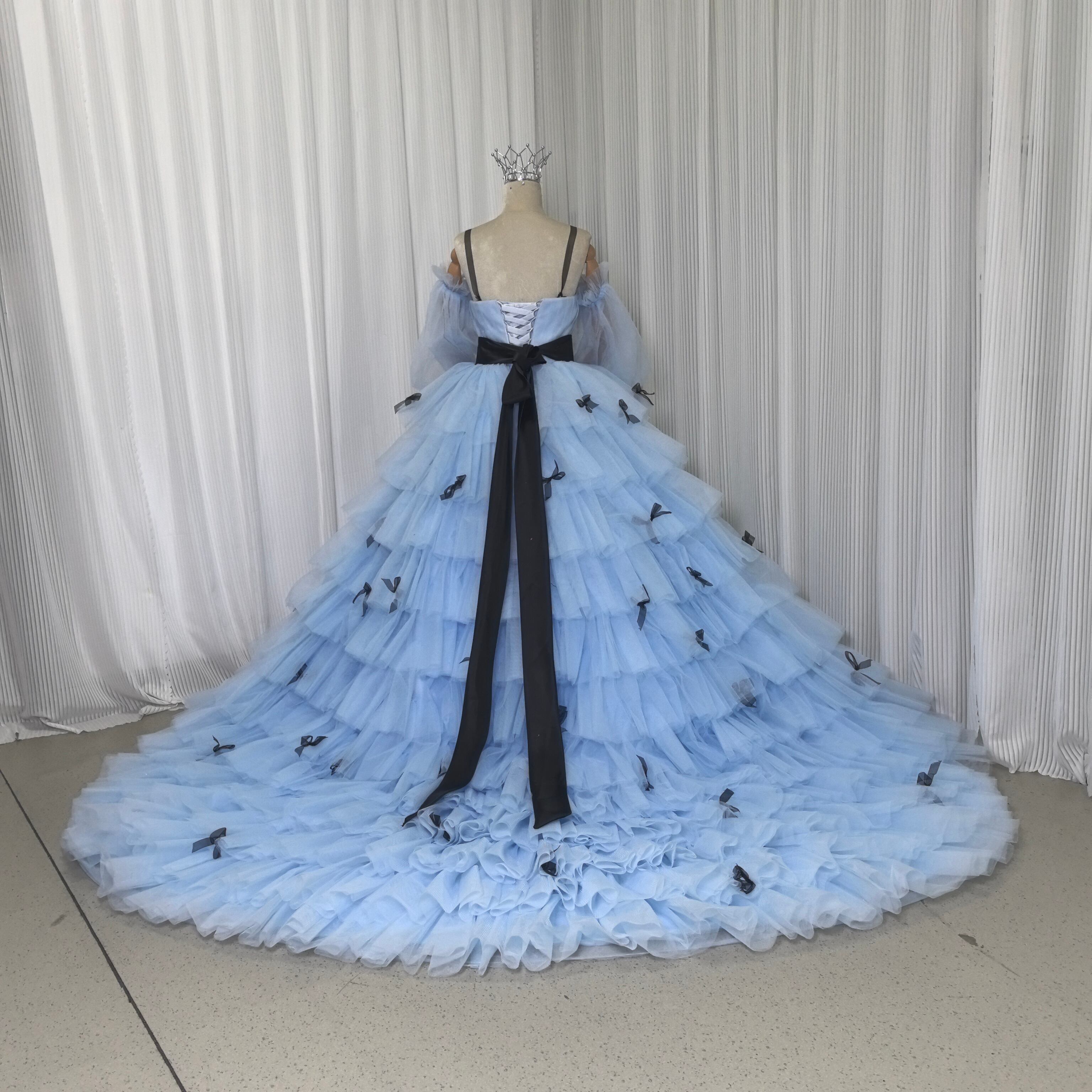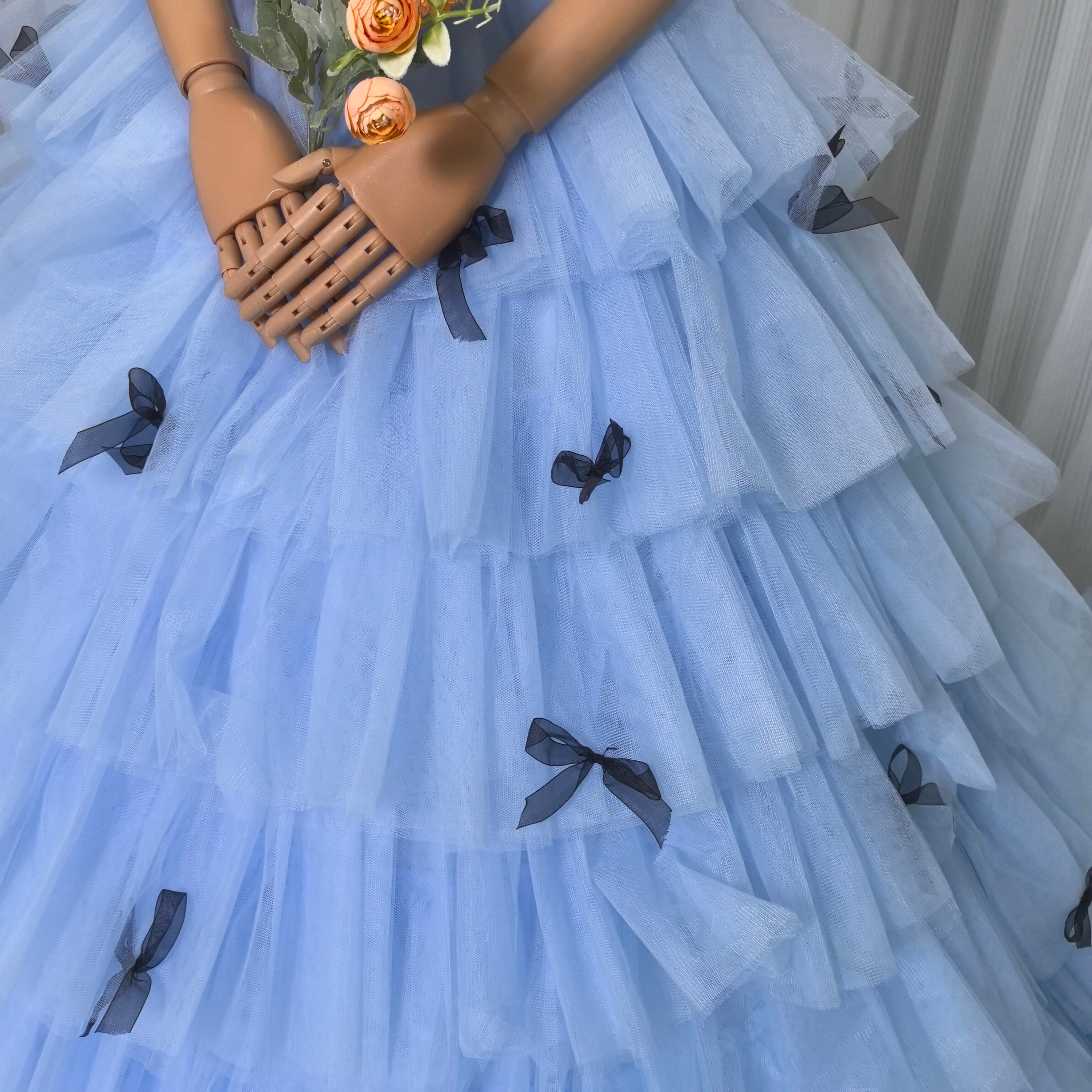 人気上昇! ライトスカイブルー リボン カラードレス ティアードのドレス 柔らかく重ねたチュールスカート 結婚式
