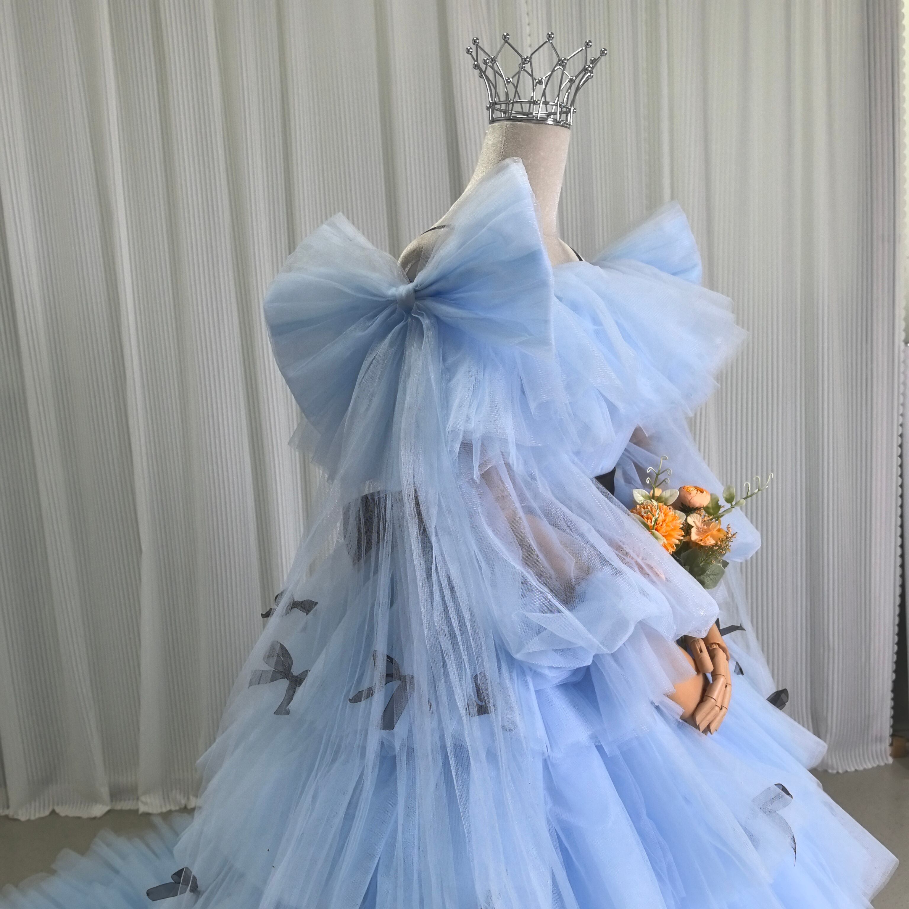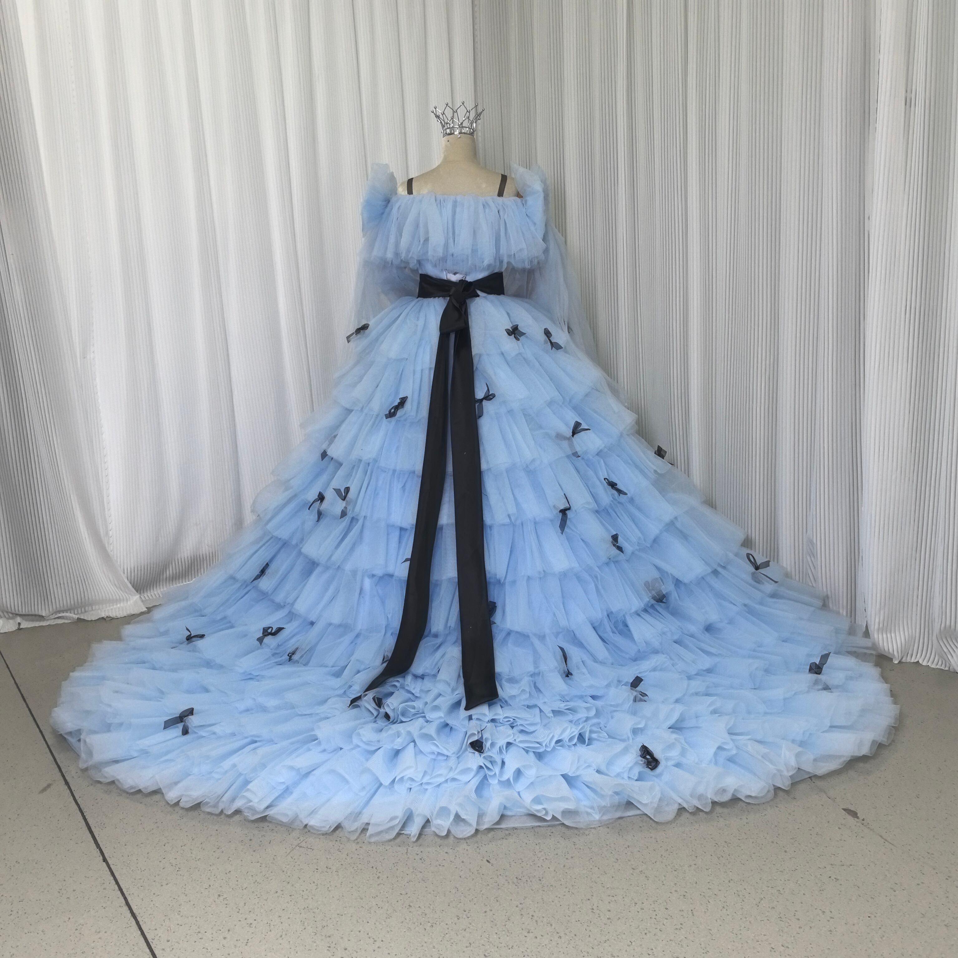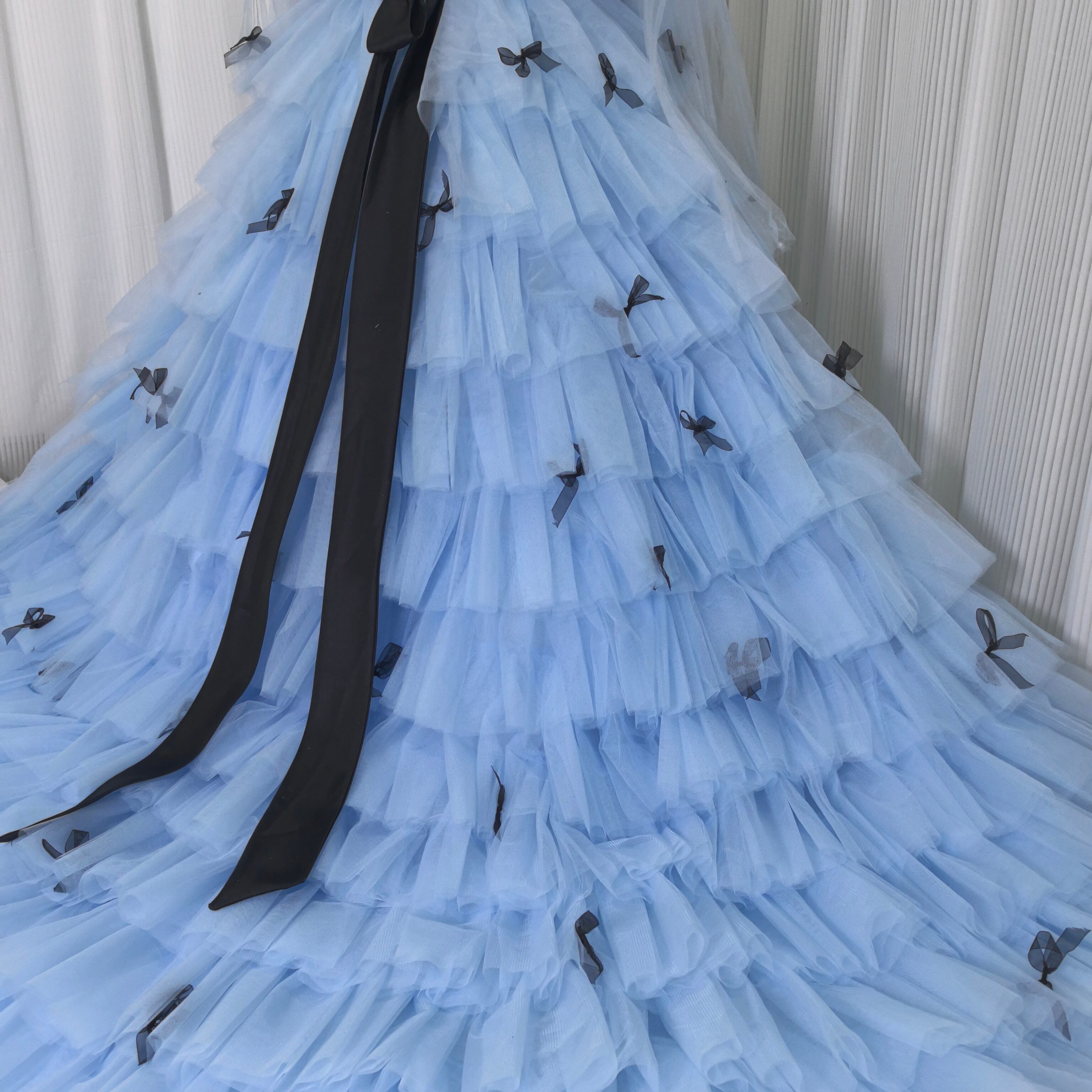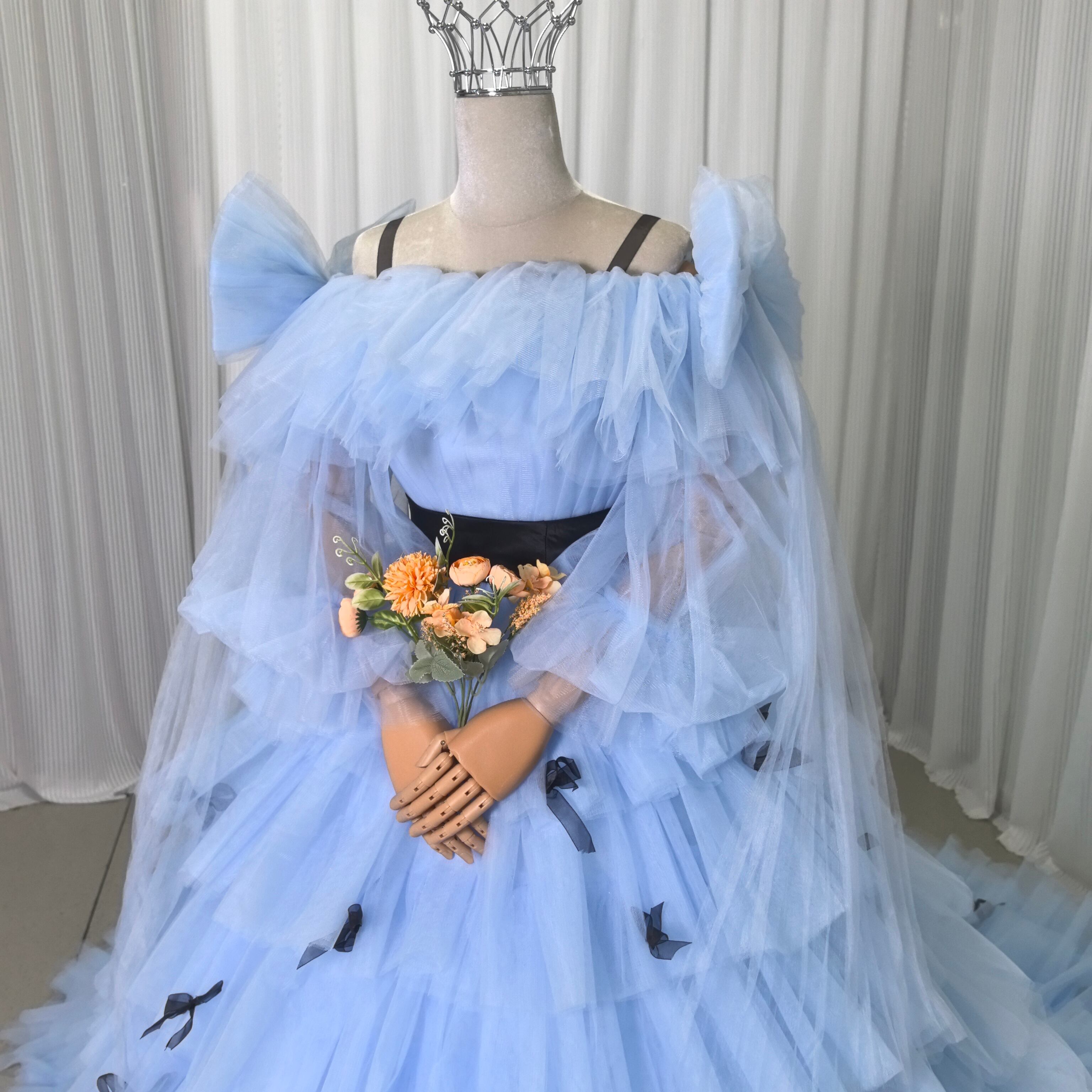 人気上昇! オフショルダー ライトスカイブルー リボン カラードレス 付け袖 オフショルダー 柔らかく重ねたチュールスカート