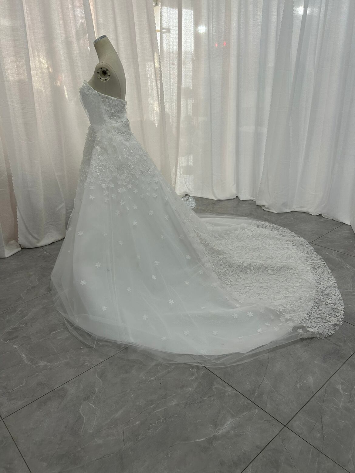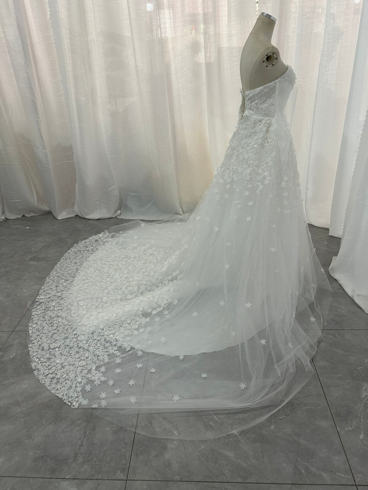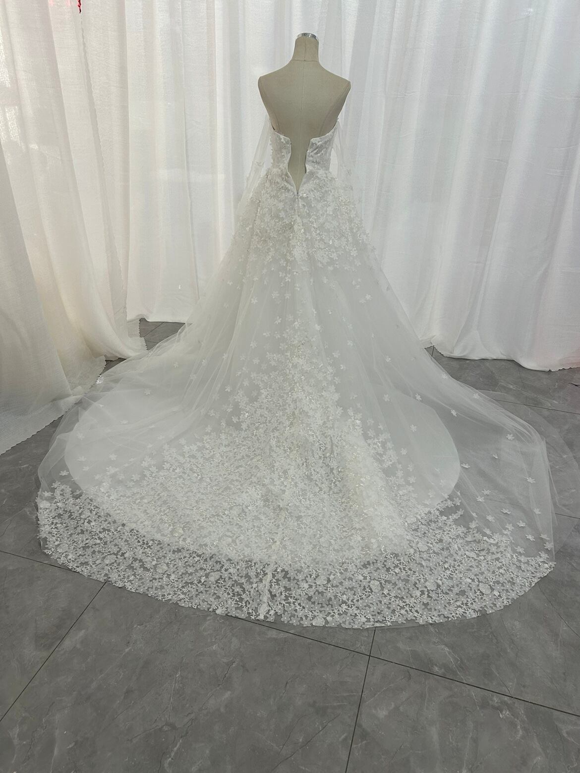 輝きな光彩を放つ !ベアトップ ウエディングドレス 上品レース ソフトチュール 華やかなトレーン /