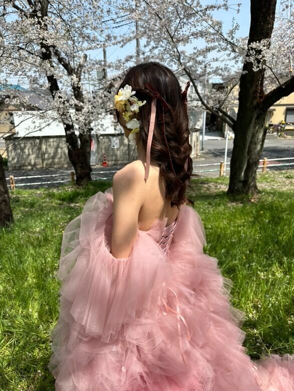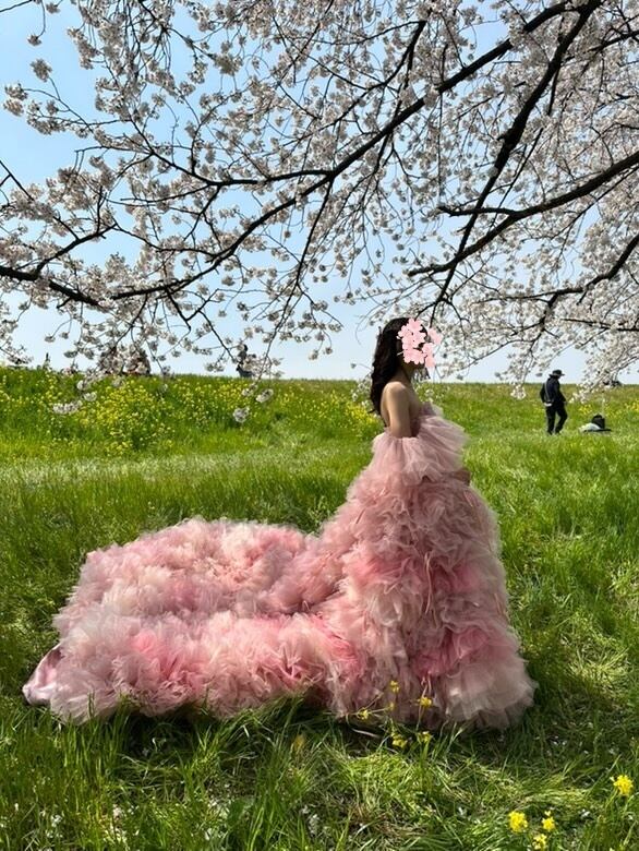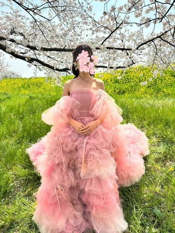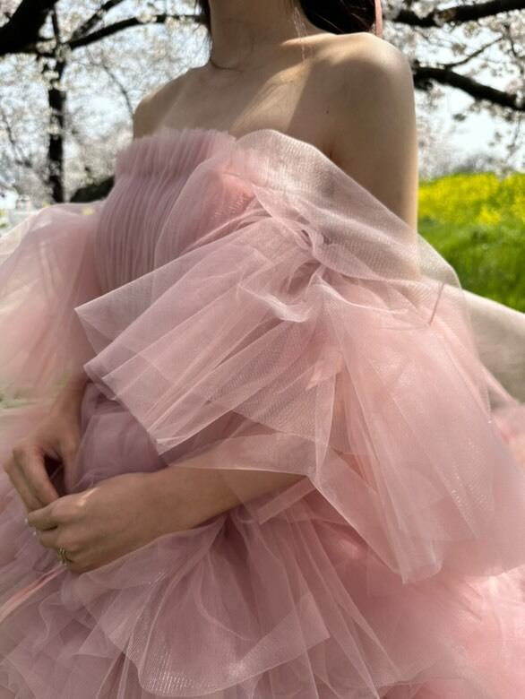 実例写真!韓国風 ピンク チュールドレスオフ カラードレス フリルオフショルダー お色直しふわふわ ボリューム