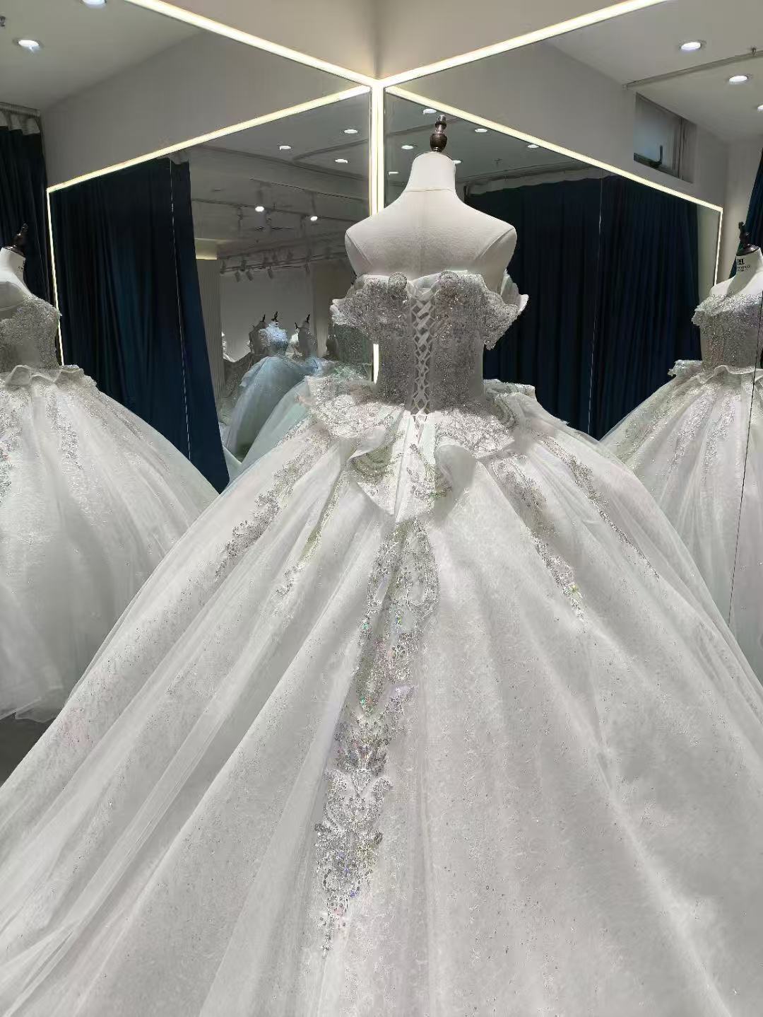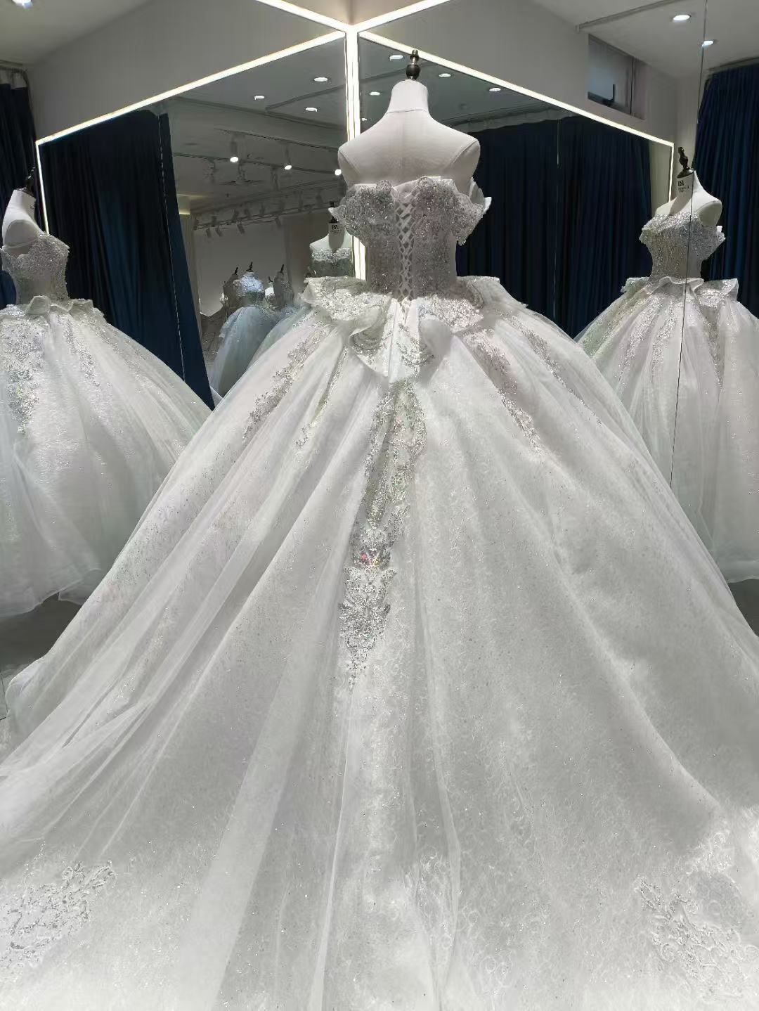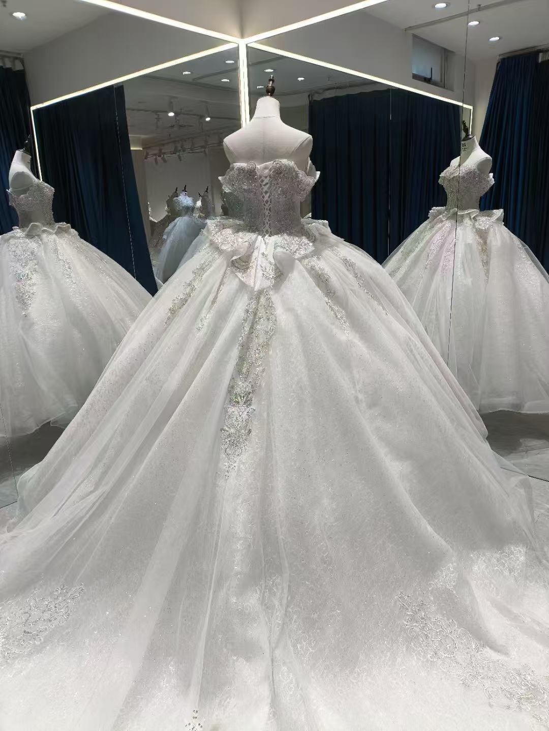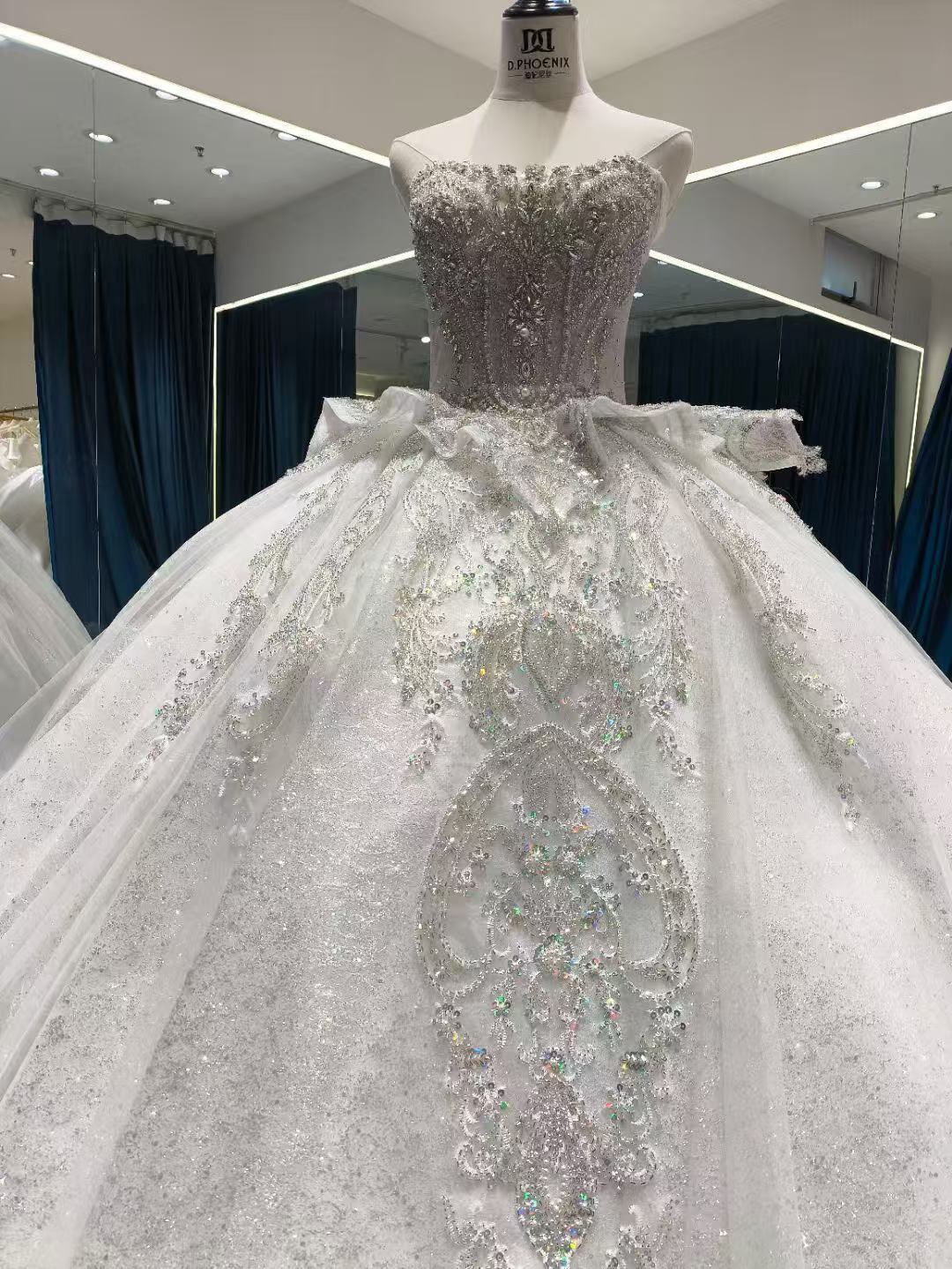 送料無料! ベアトップ ウエディングドレス キラキラチュール パーティードレス 細見えシルエット花嫁/結婚式/披露宴