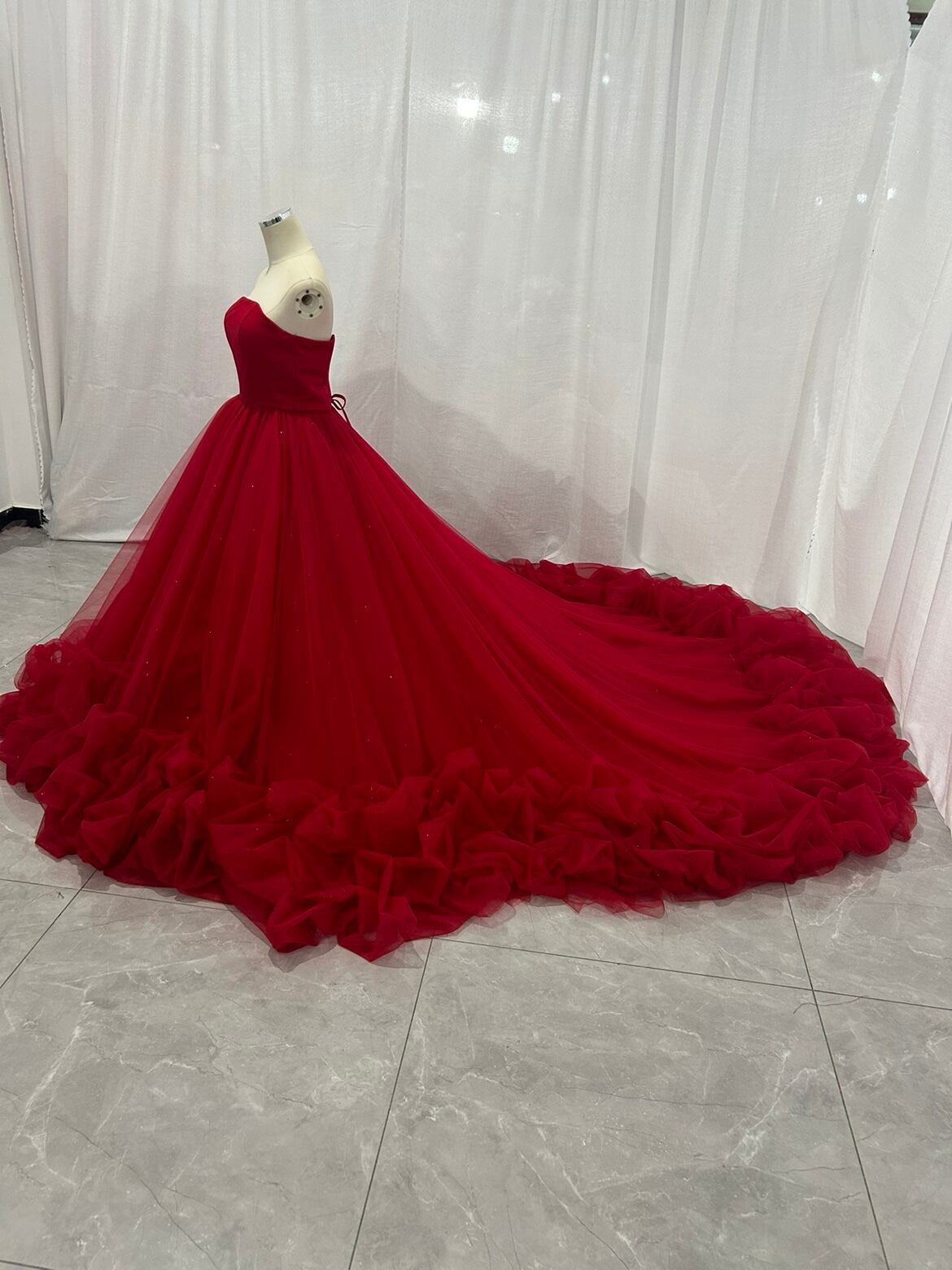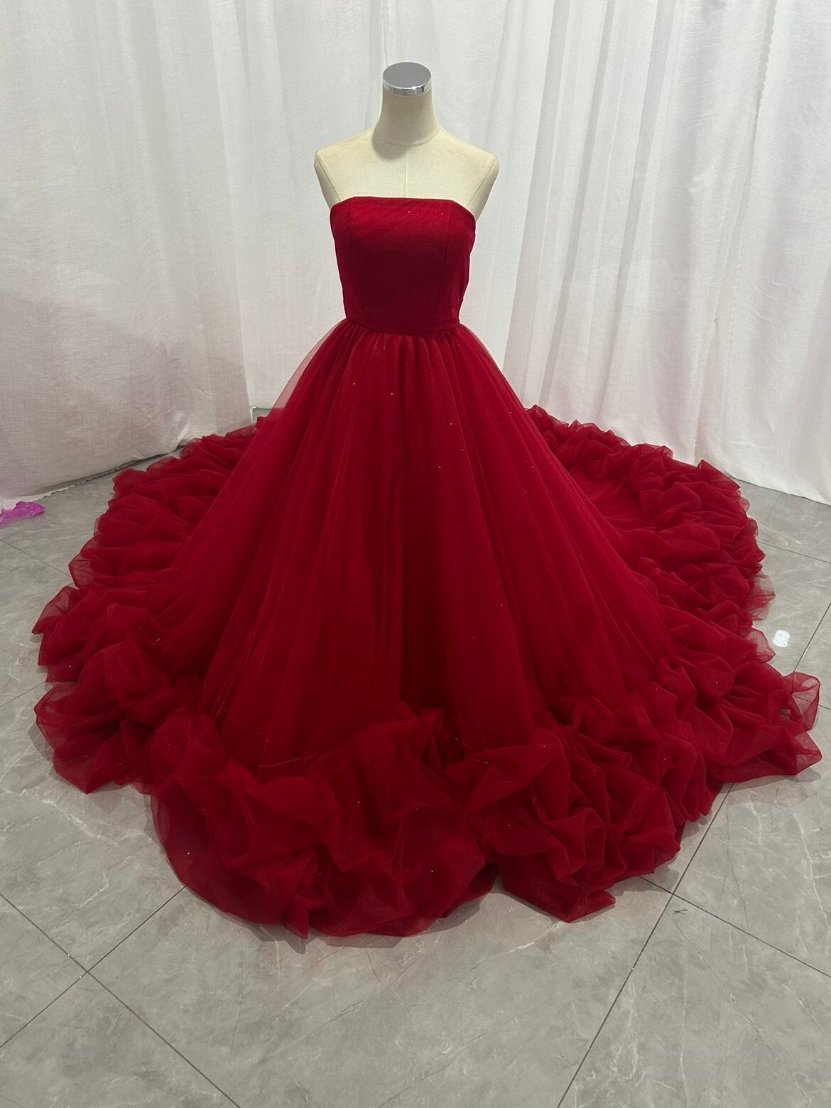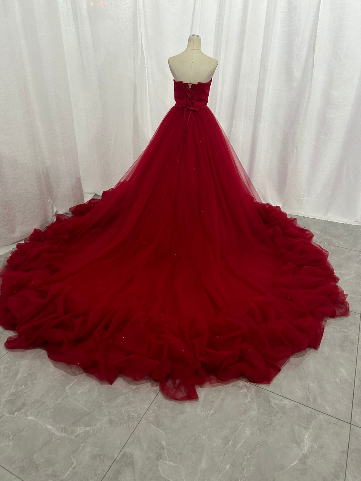 輝きな光彩を放つ パステル ボルドー色 カラードレスキラキラチュール裾に繊細レースをあしらった華やかなトレーン プリンセス