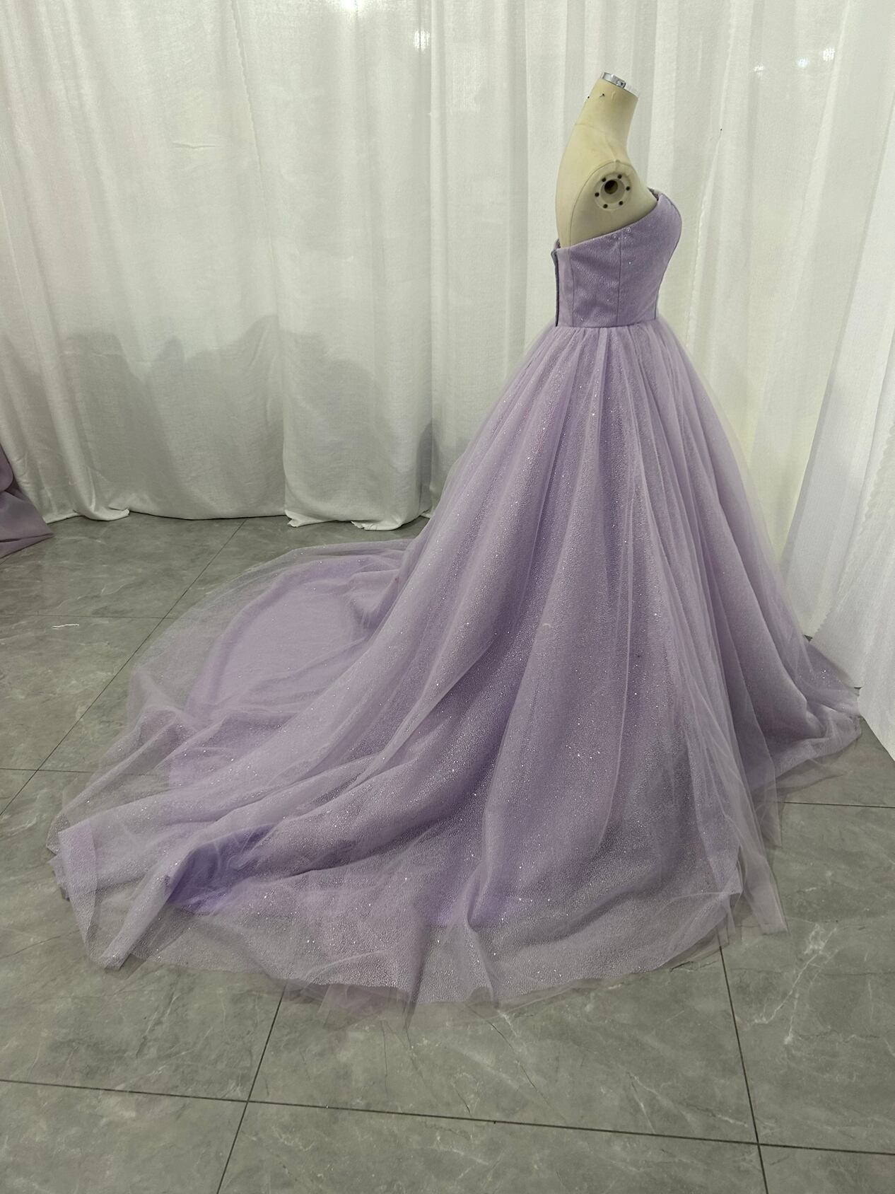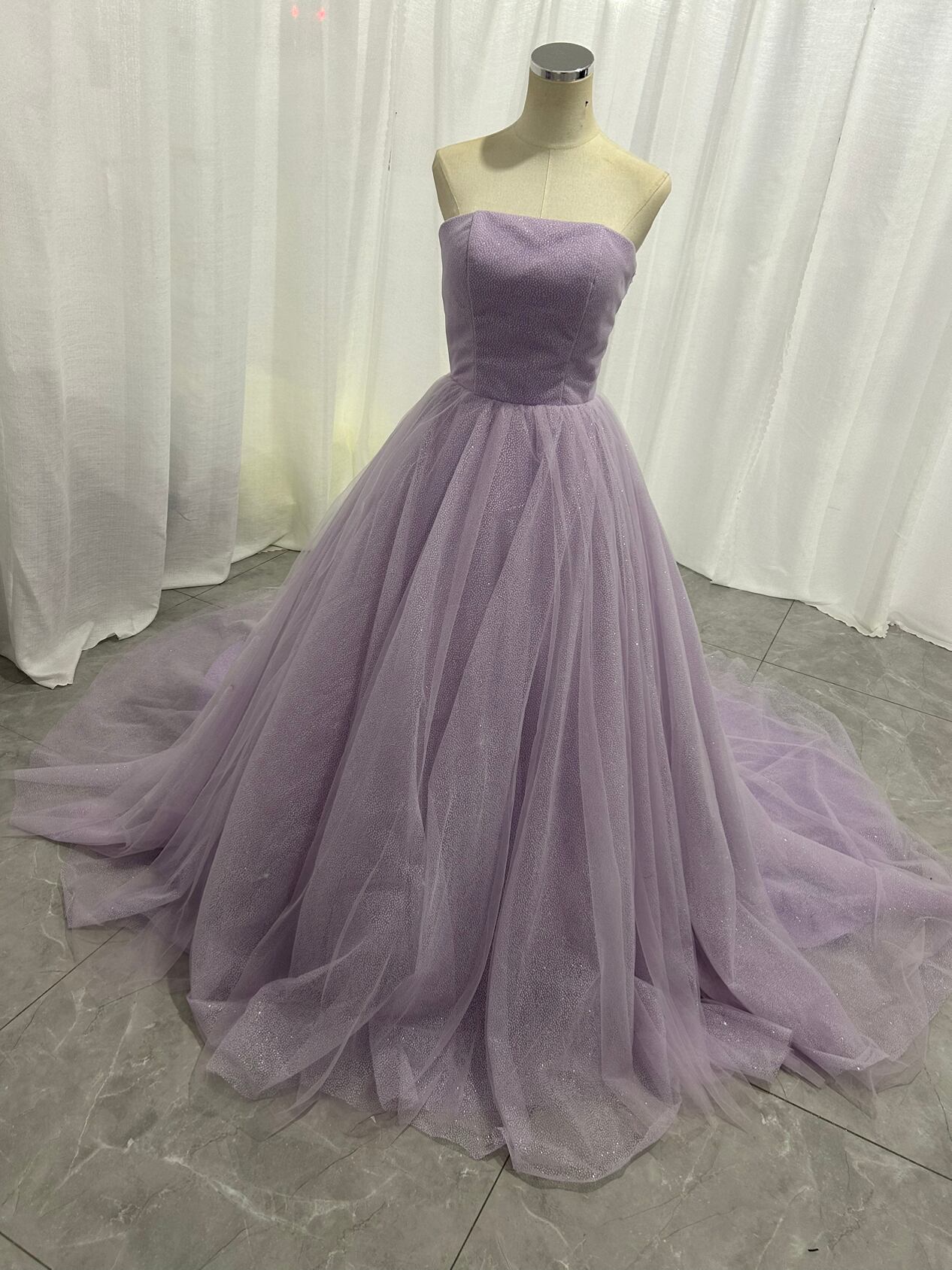 人気上昇! 薄 パープル ベアトップ カラードレス チュールドレス 華やかなトレーン お色直し結婚式 披露宴