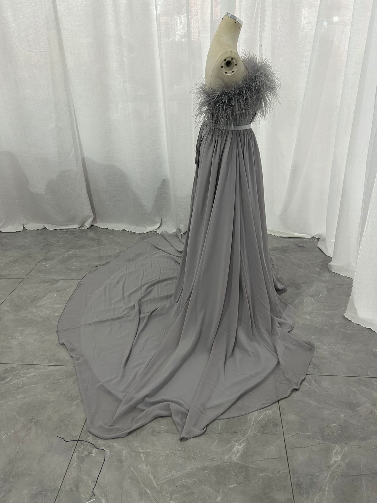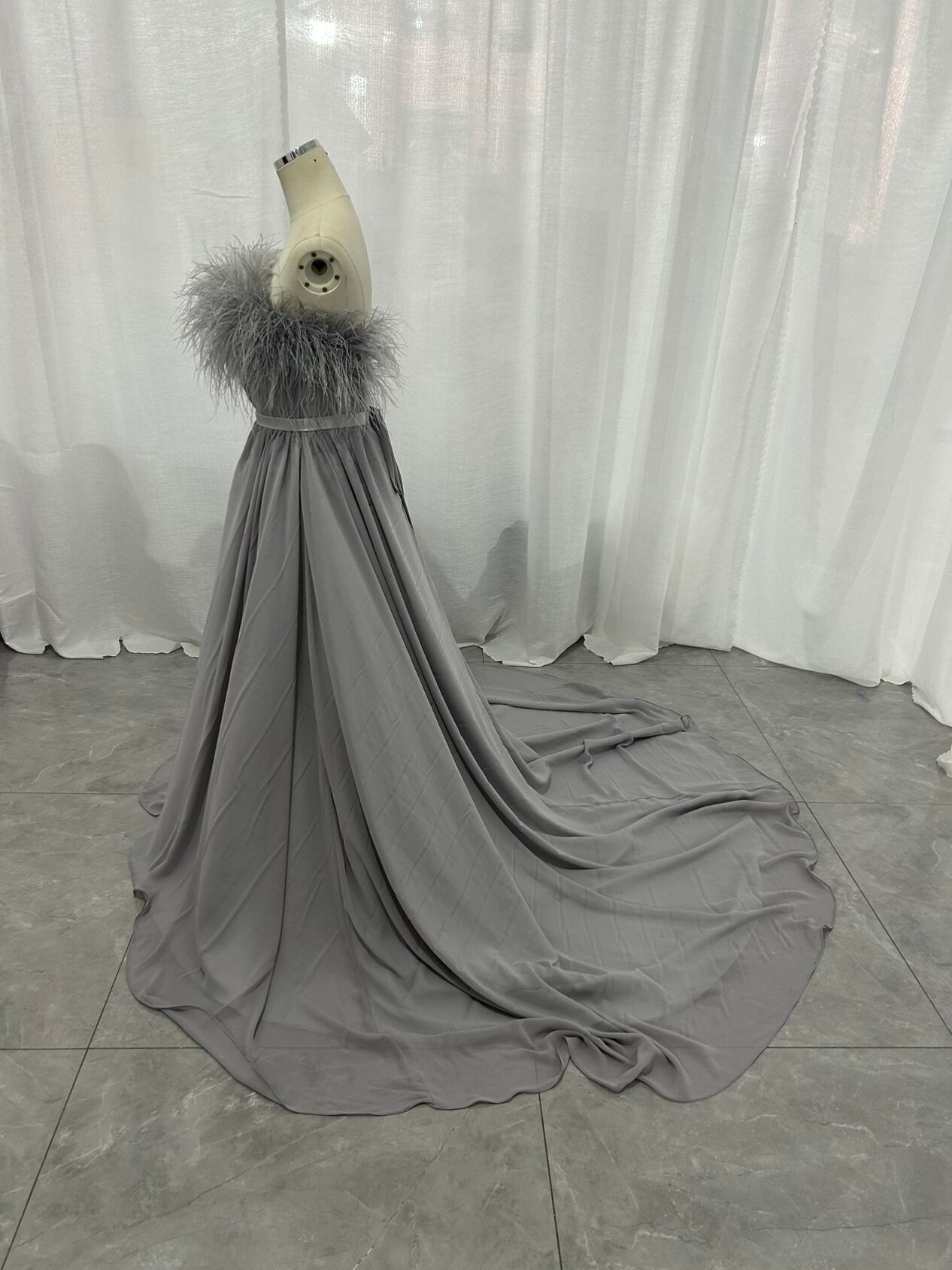 送料無料!グレー カラードレス ファーフェザー オフショルダー ロングトレーン マーメイドパーティードレス 前撮り/