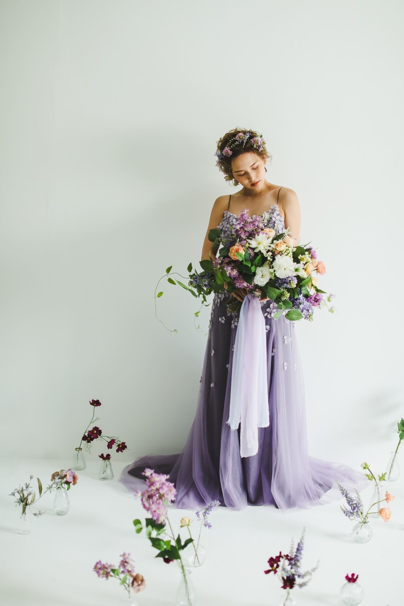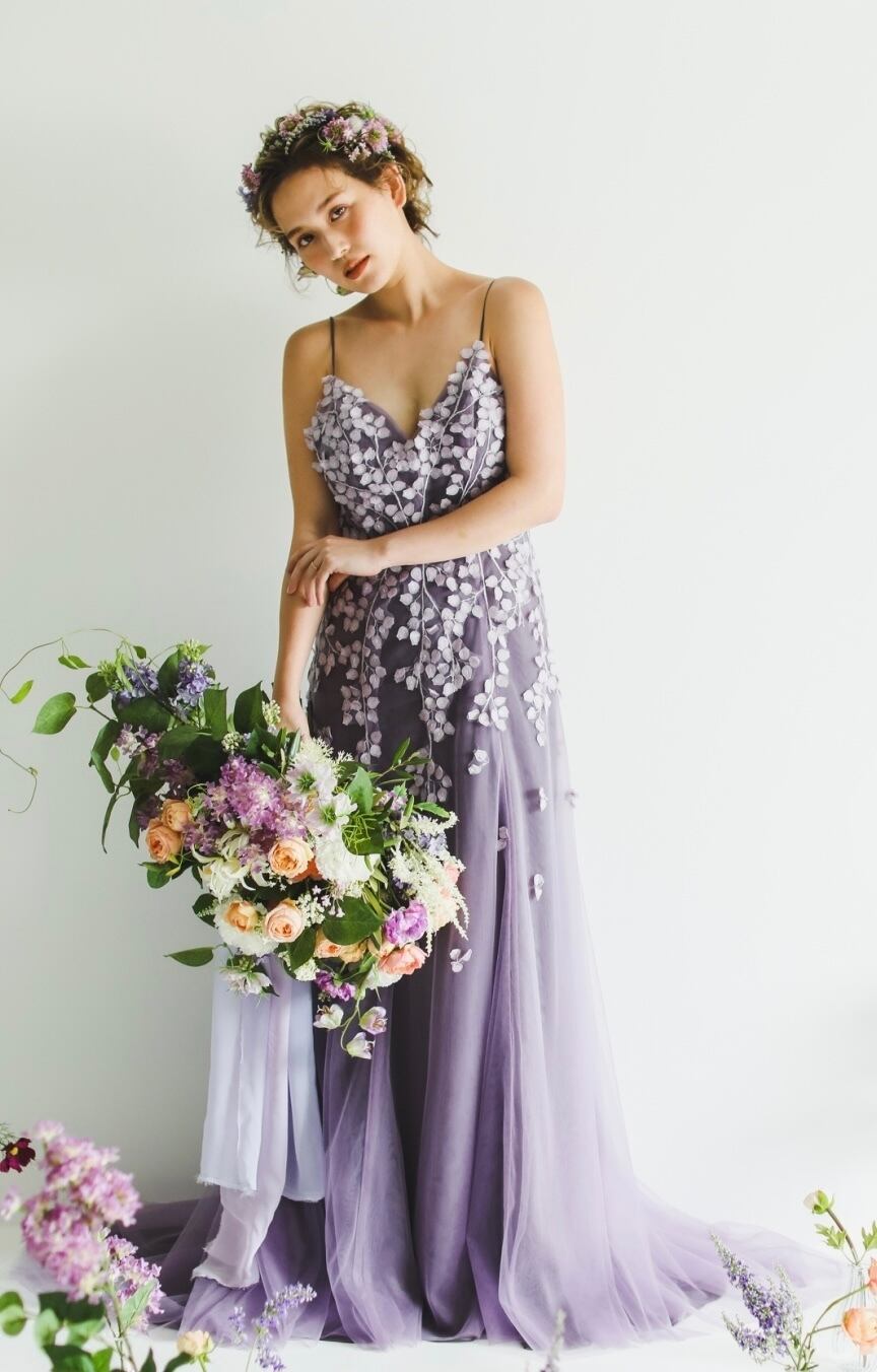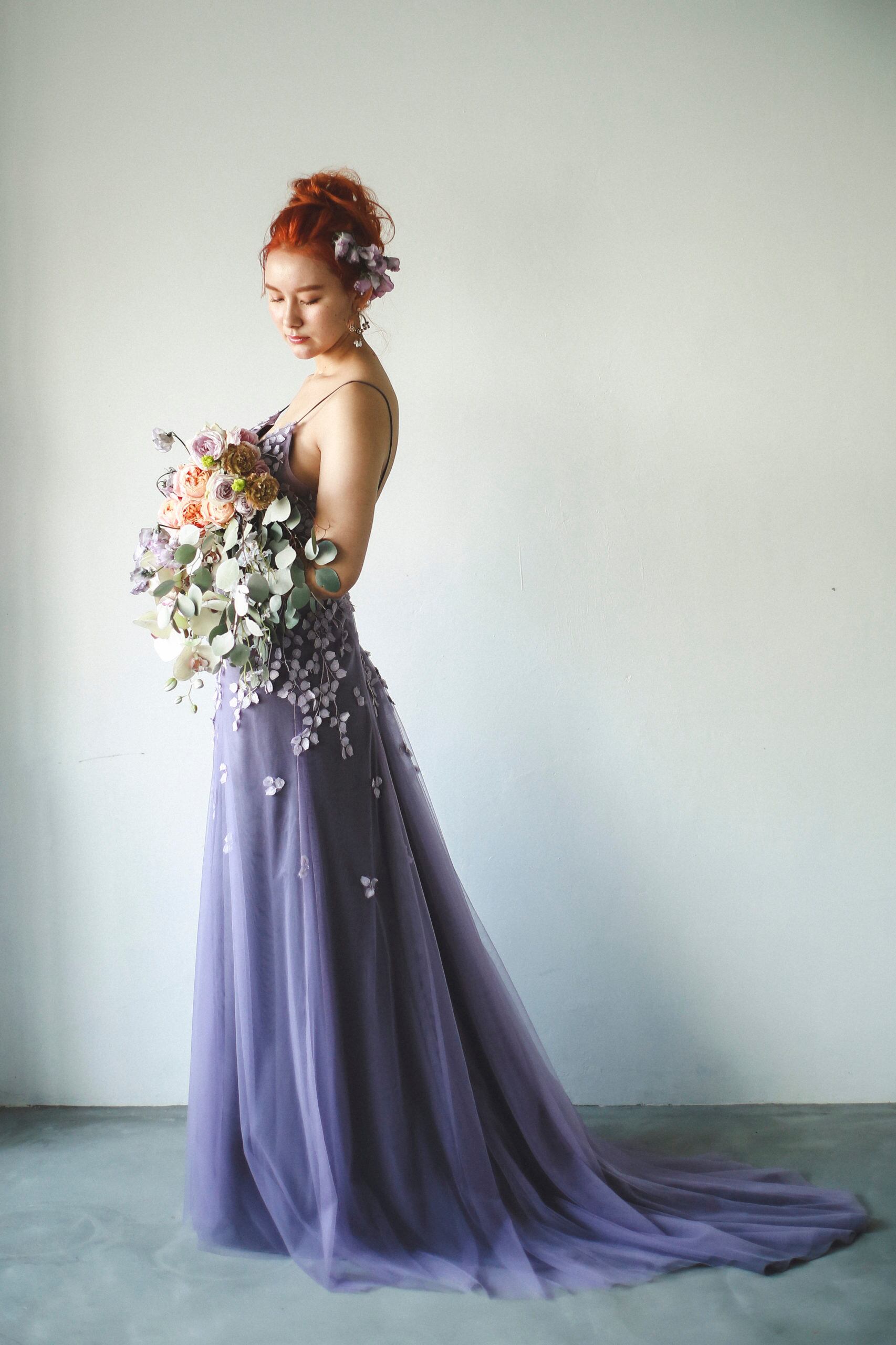 人気上昇! 薄 パープル キャミソール カラードレス チュールドレス 3D立体レース刺繍 華やかなトレーン お色直し結婚式 披露宴