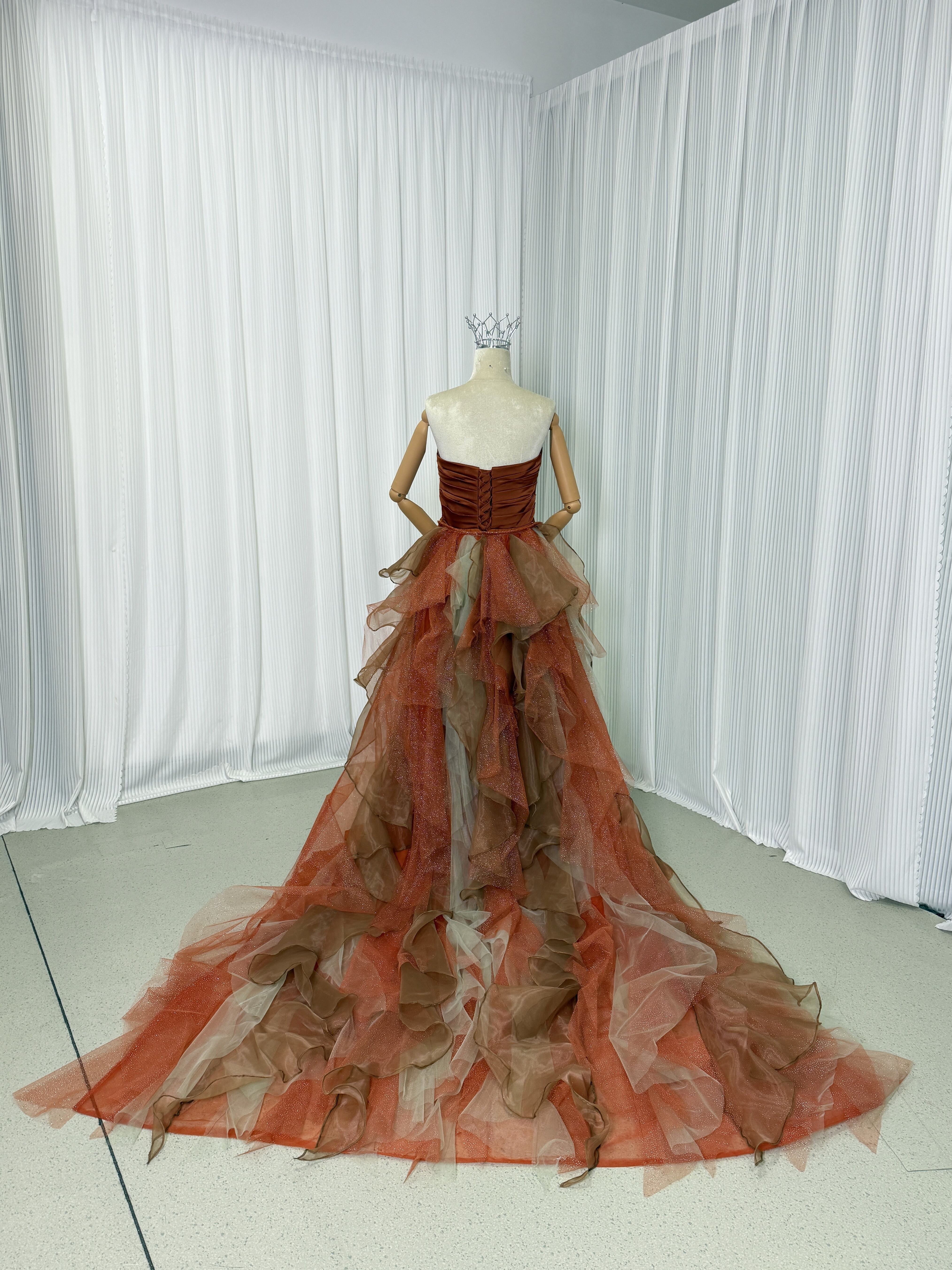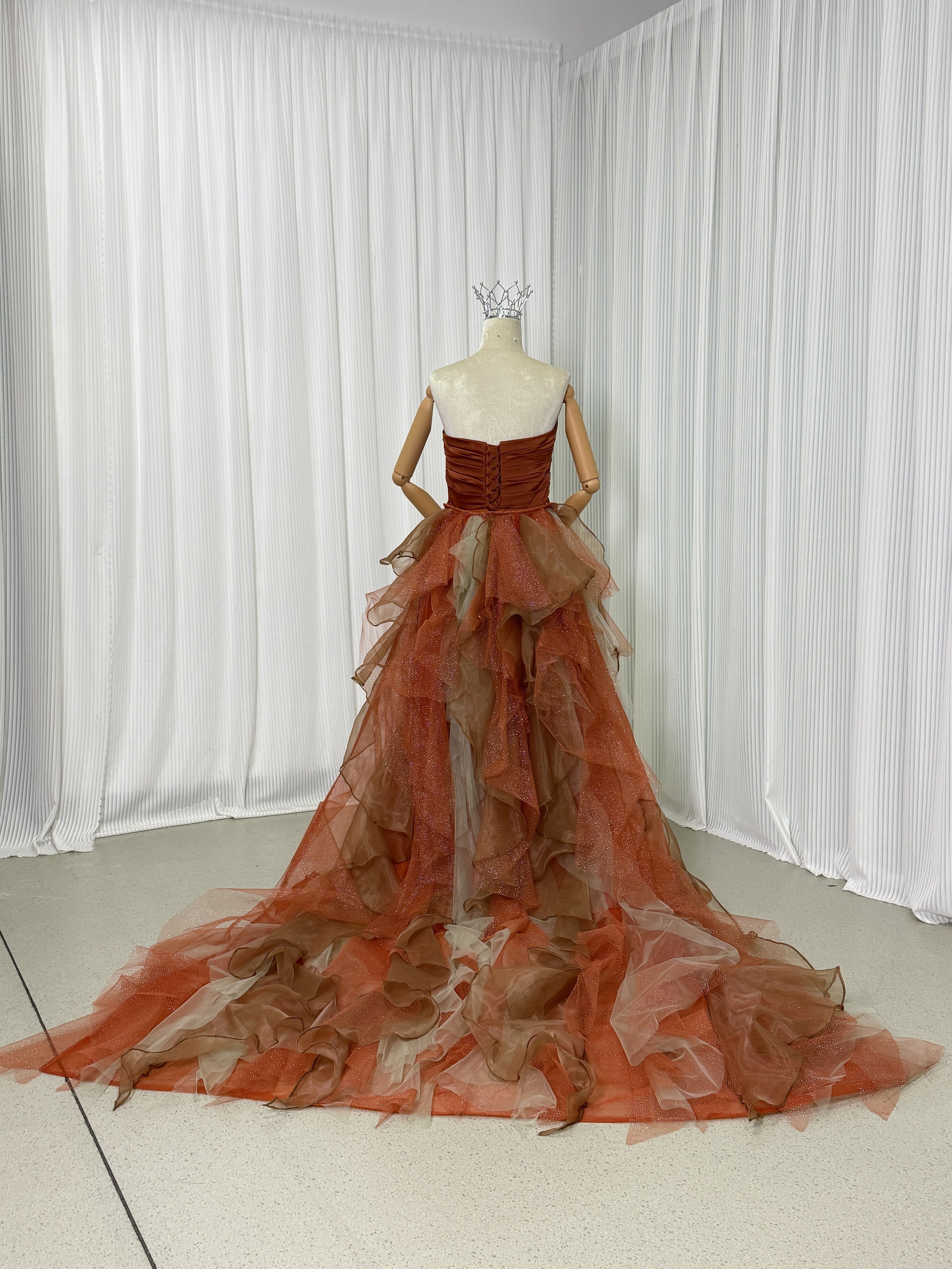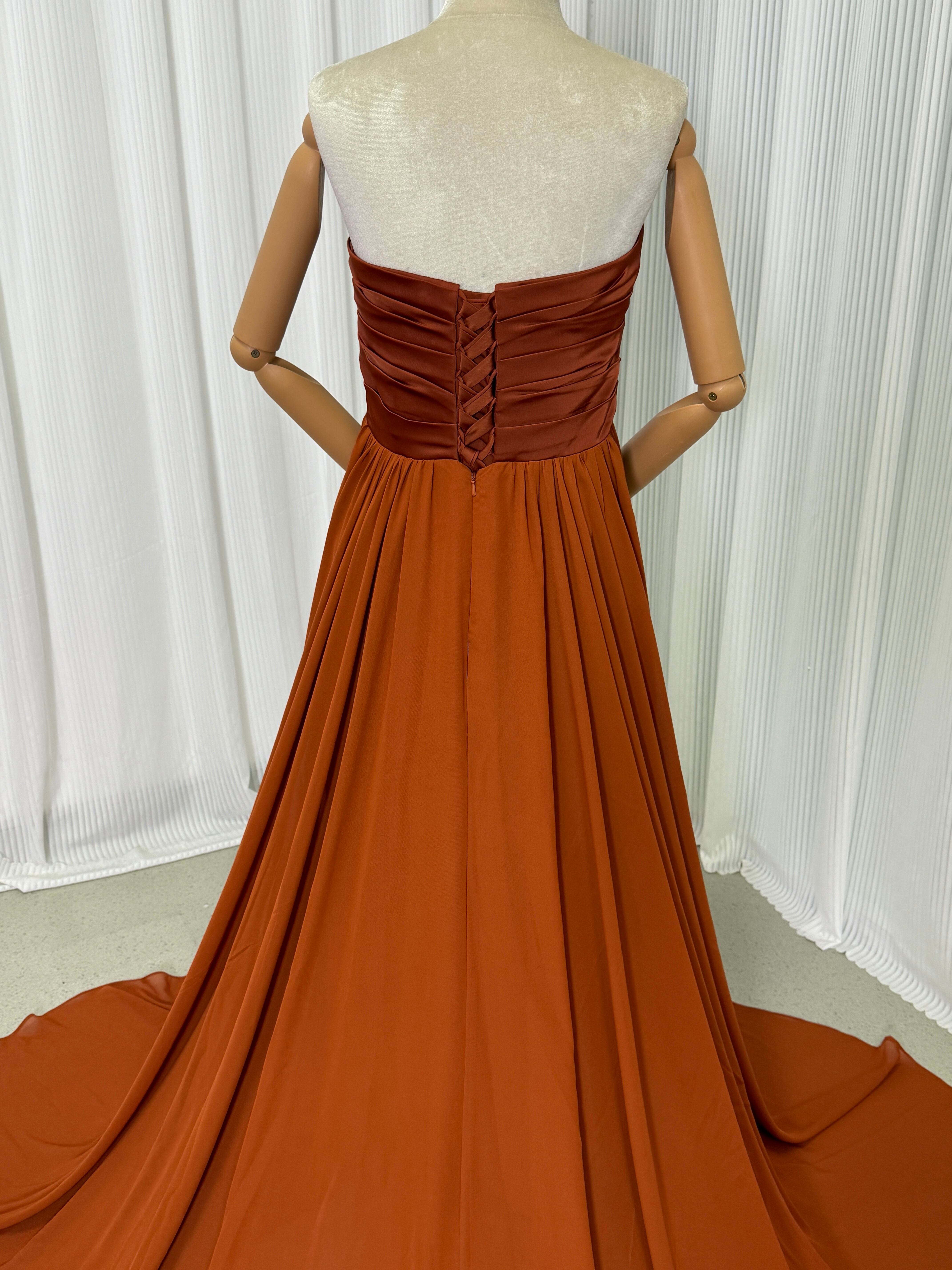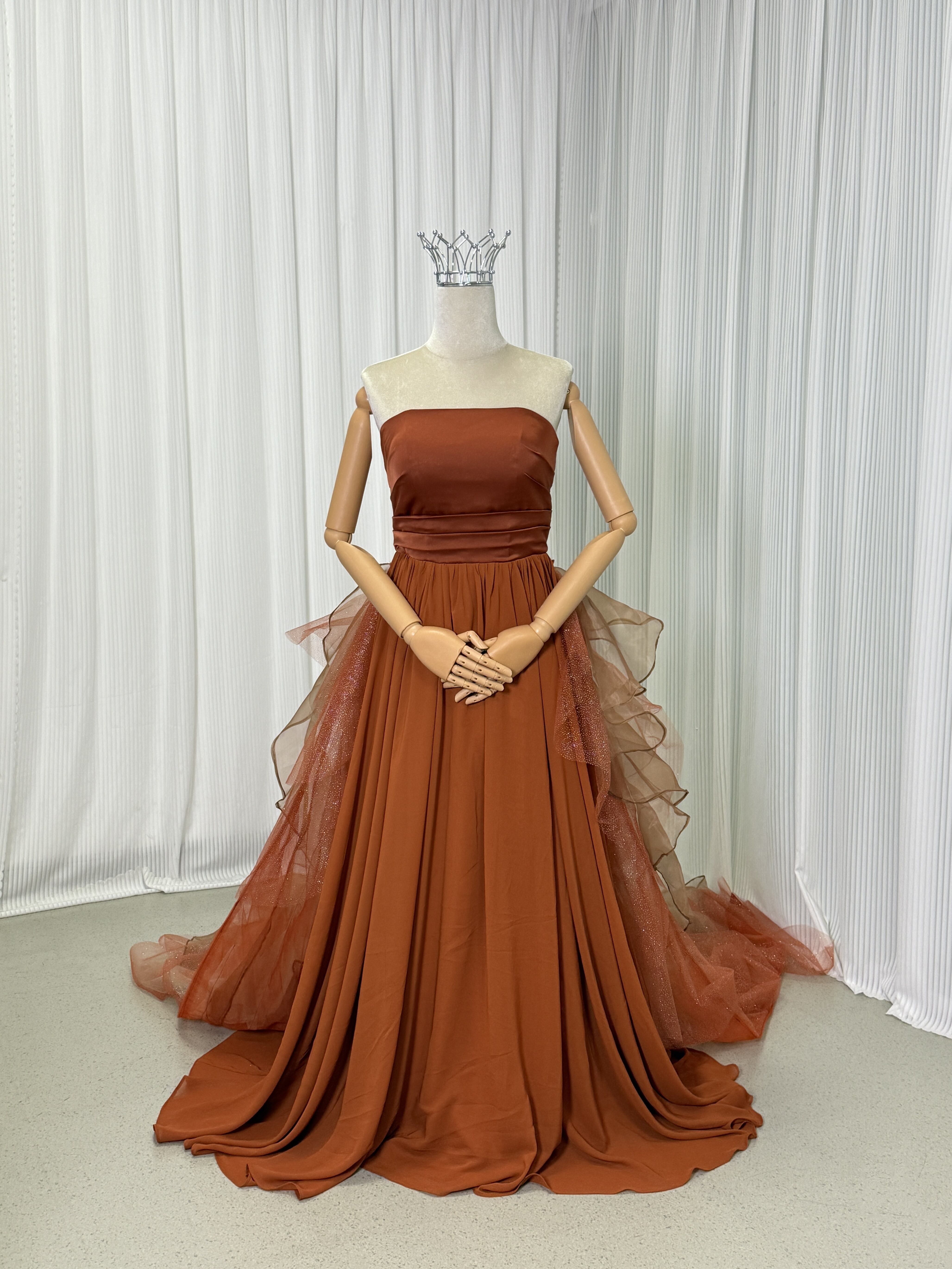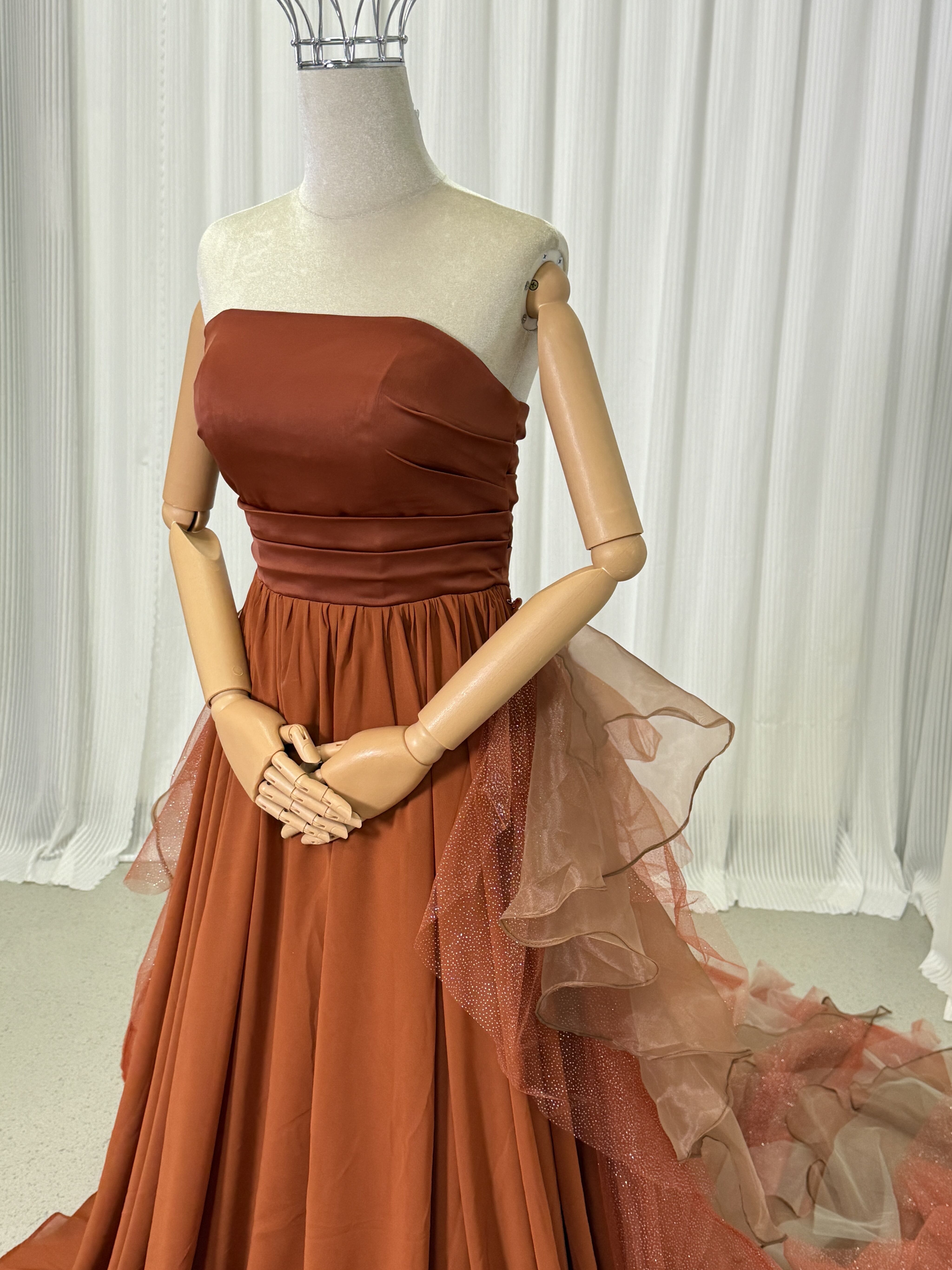 人気上昇! テラコッタ色 ベアトップ カラードレス ふっくら柔らかなバック 華やかなトレーン お色直し結婚式 披露宴