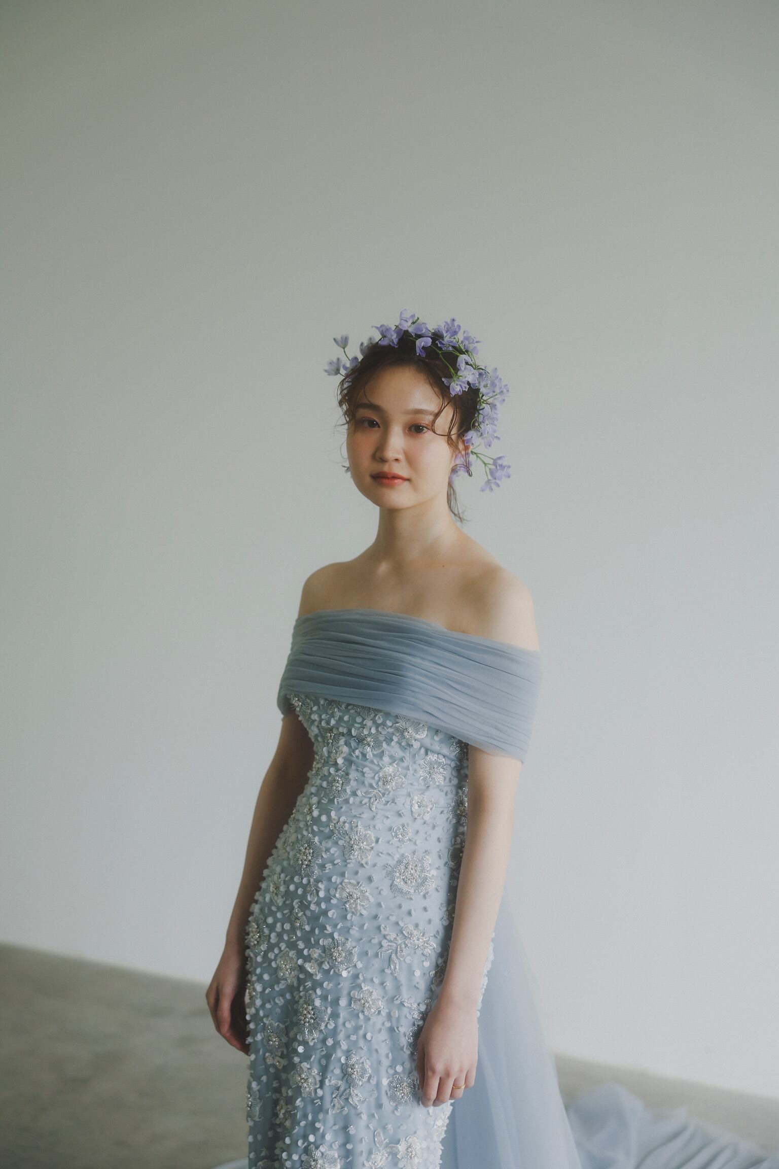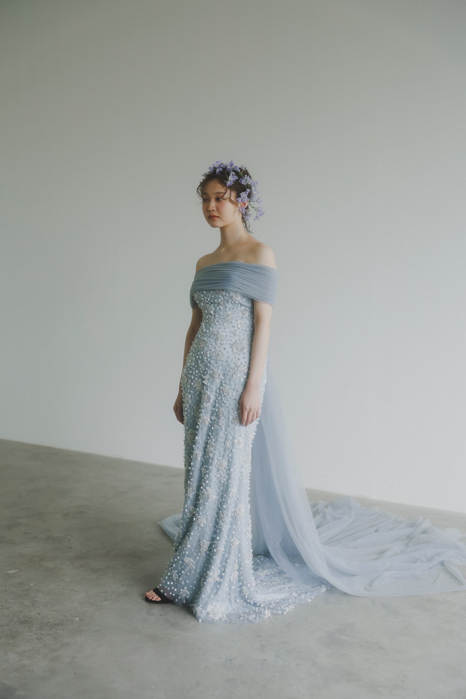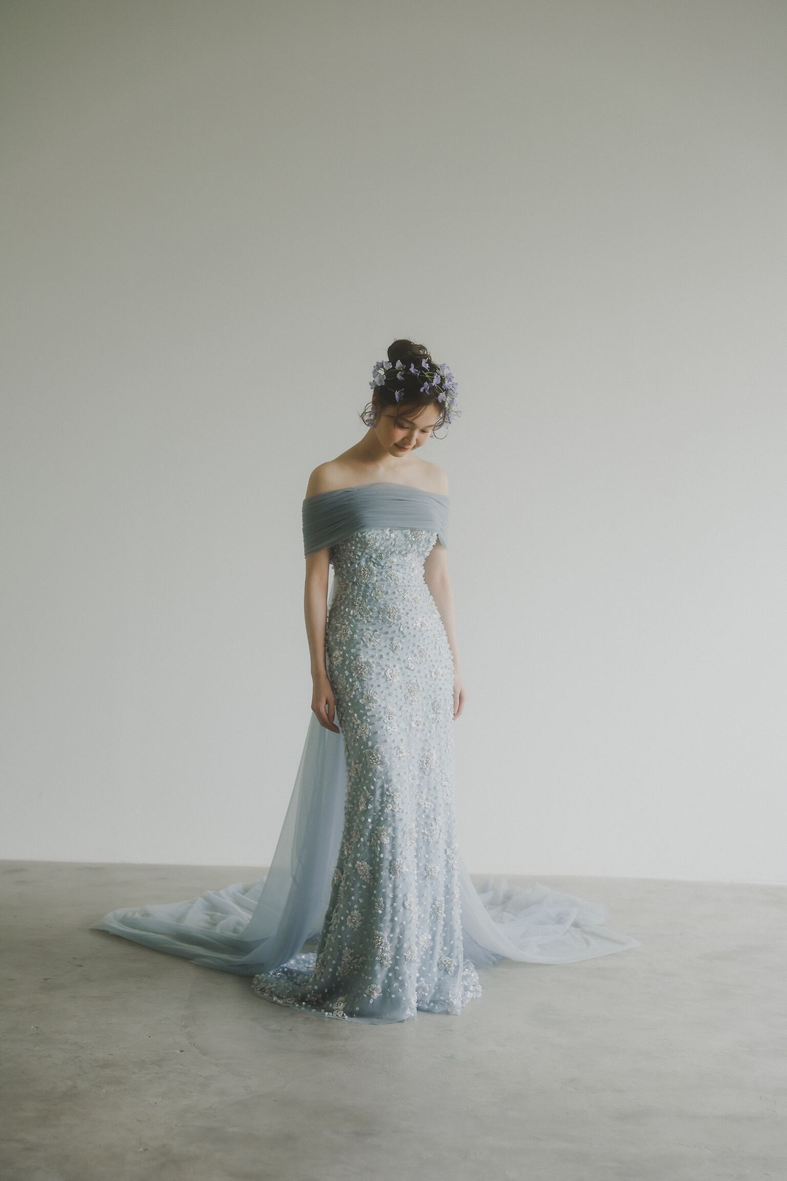 人気上昇! グレー カラードレス オフショルダー 3D立体レース刺繍 ソフトマーメイドライン お色直し結婚式 披露宴