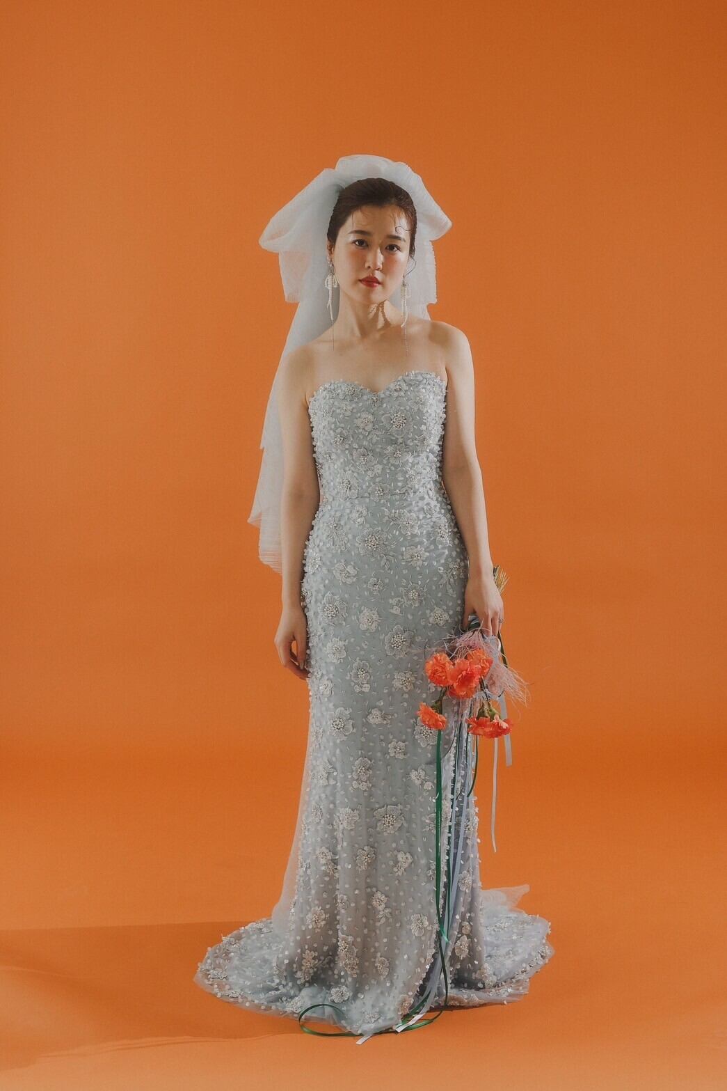 人気上昇! グレー カラードレス  ベアトップ 3D立体レース刺繍 ソフトマーメイドライン お色直し結婚式 披露宴
