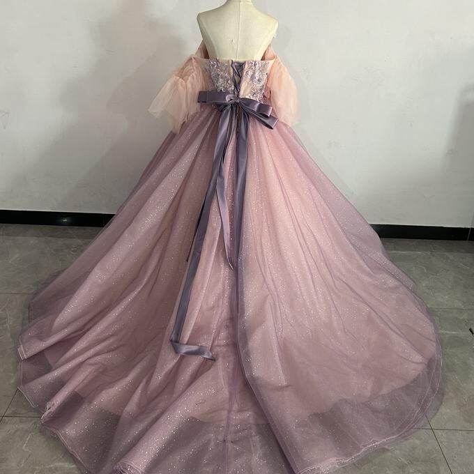 カラードレス 刺繡チュール リボン チュール生地 編み上げ パープル パフスリーブ お色直し 結婚式