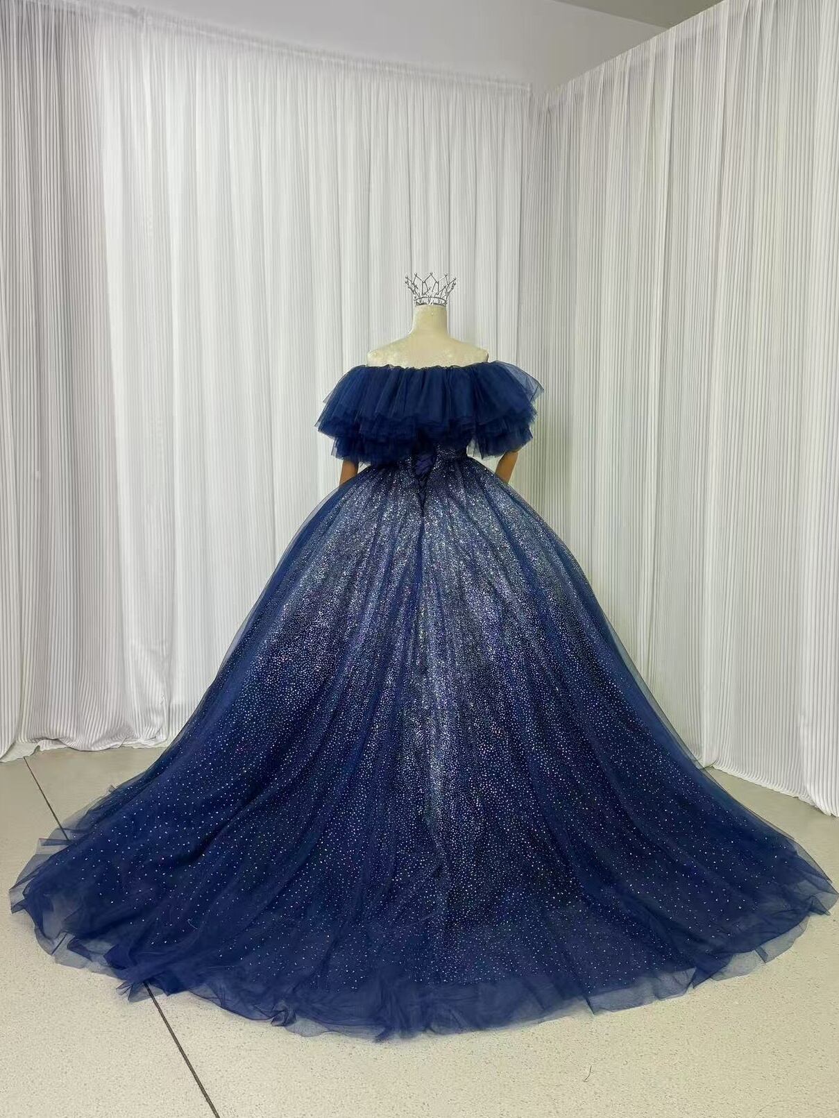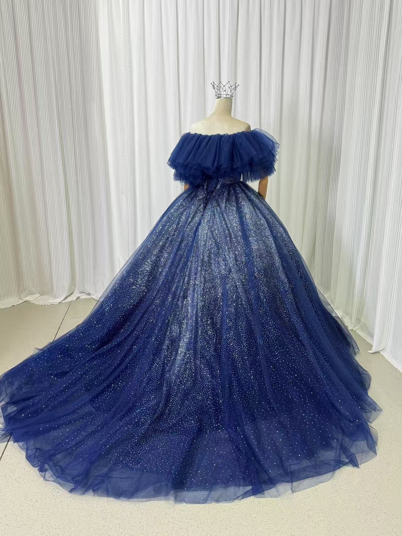 送料無料!高品質! ネイビー 取り外しオフショルダー キラキラチュール カラードレス パーティードレス プリンセスライン