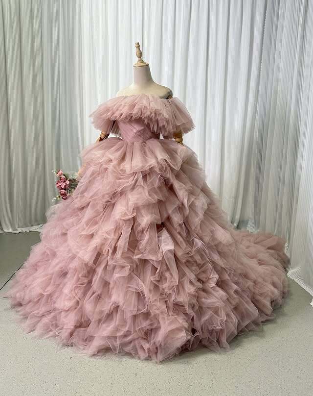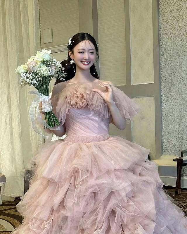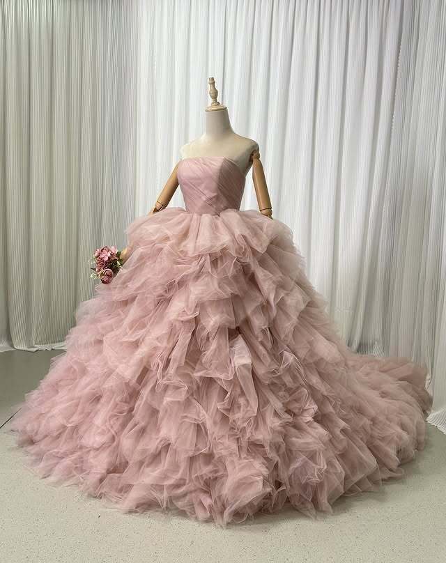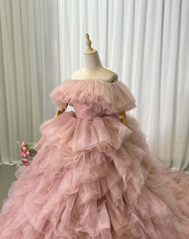 実例写真!ピンク 取り外しオフショルダー カラードレス パーティードレス 柔らかく重ねたチュールスカート前撮り/花嫁/結婚式/披露宴/ 二次会/2次会