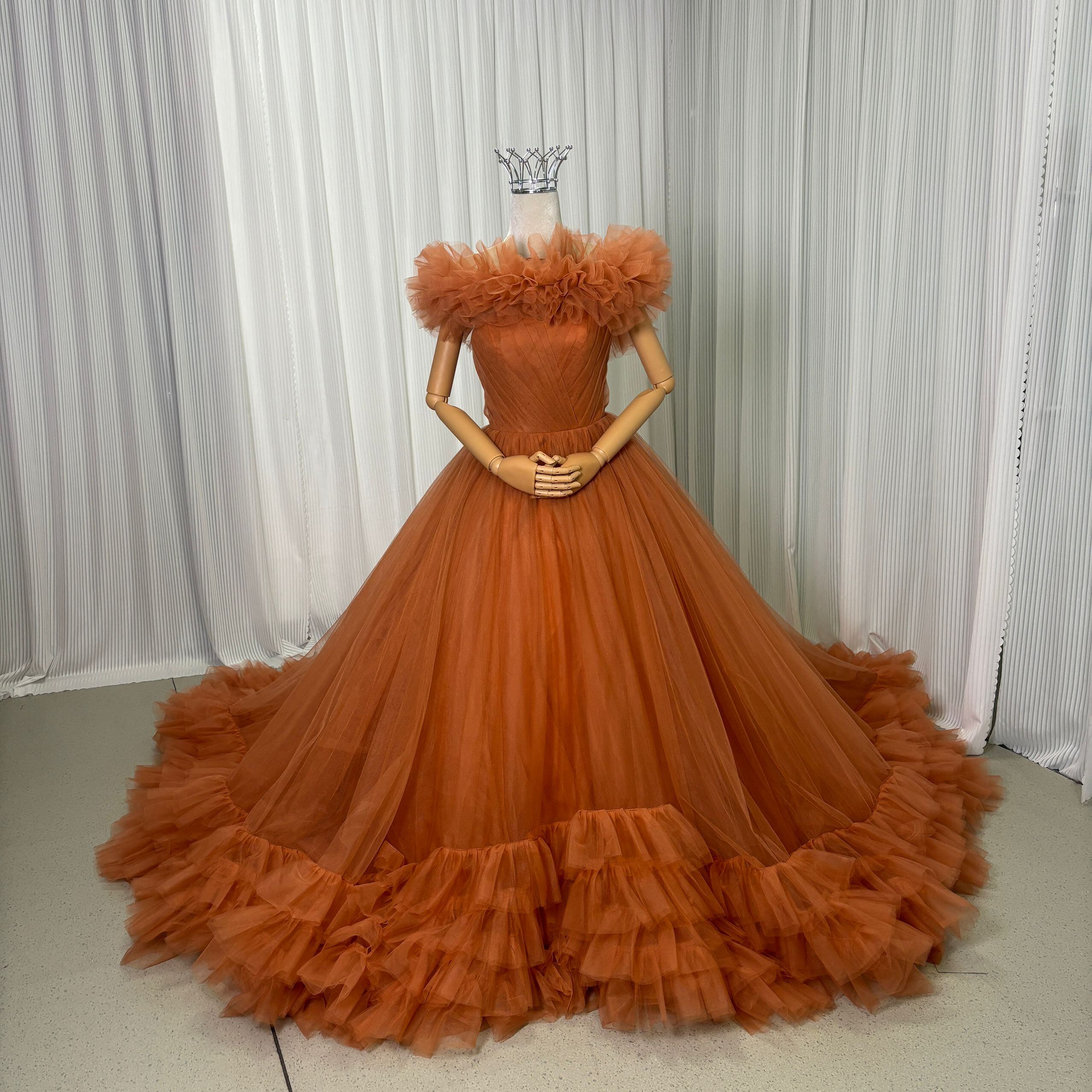 テラコッタ色 取り外しオフショルダー カラードレス パーティードレス華やかなトレーン 前撮り/花嫁/結婚式/披露宴/ 二次会/2次会