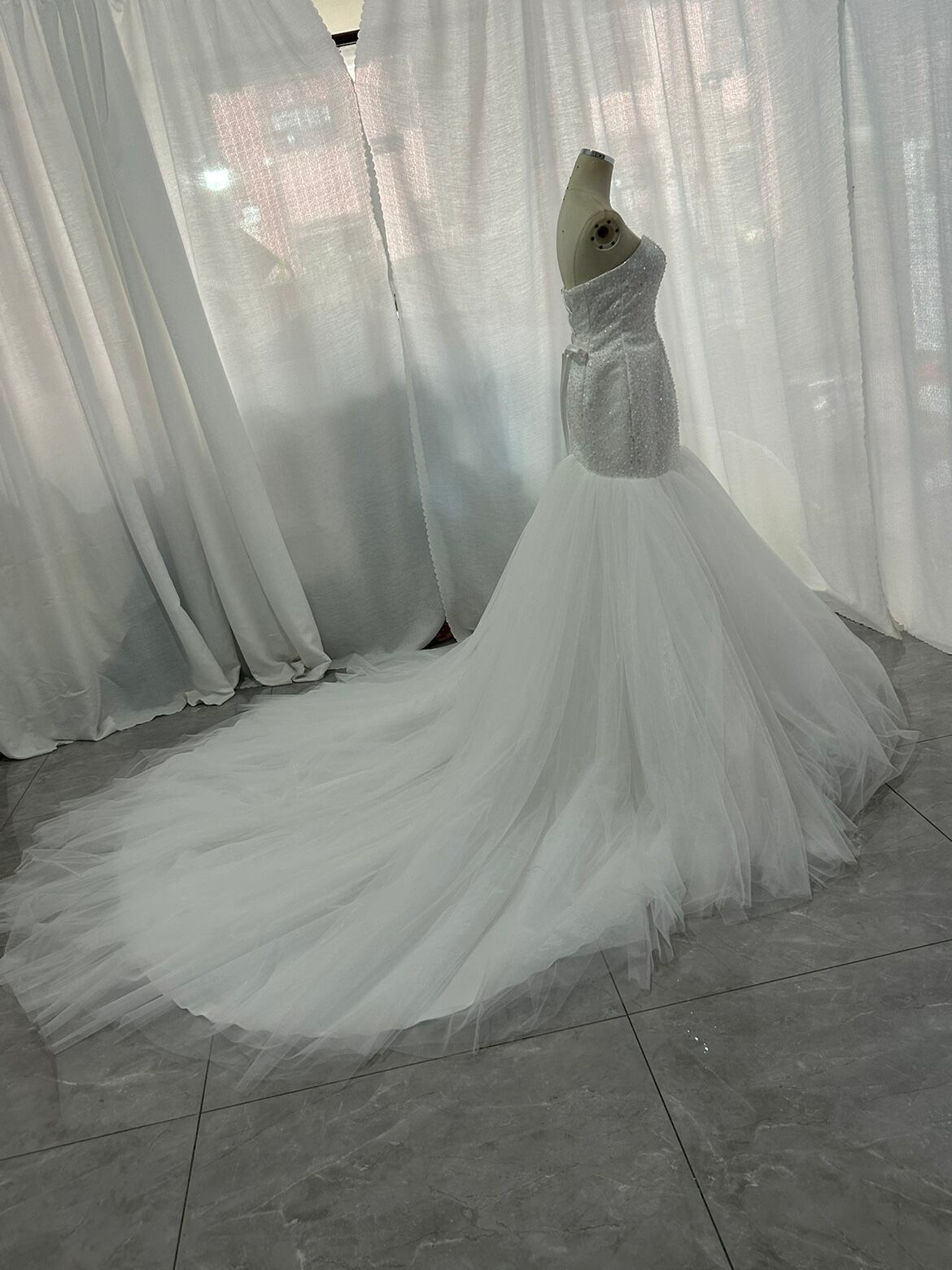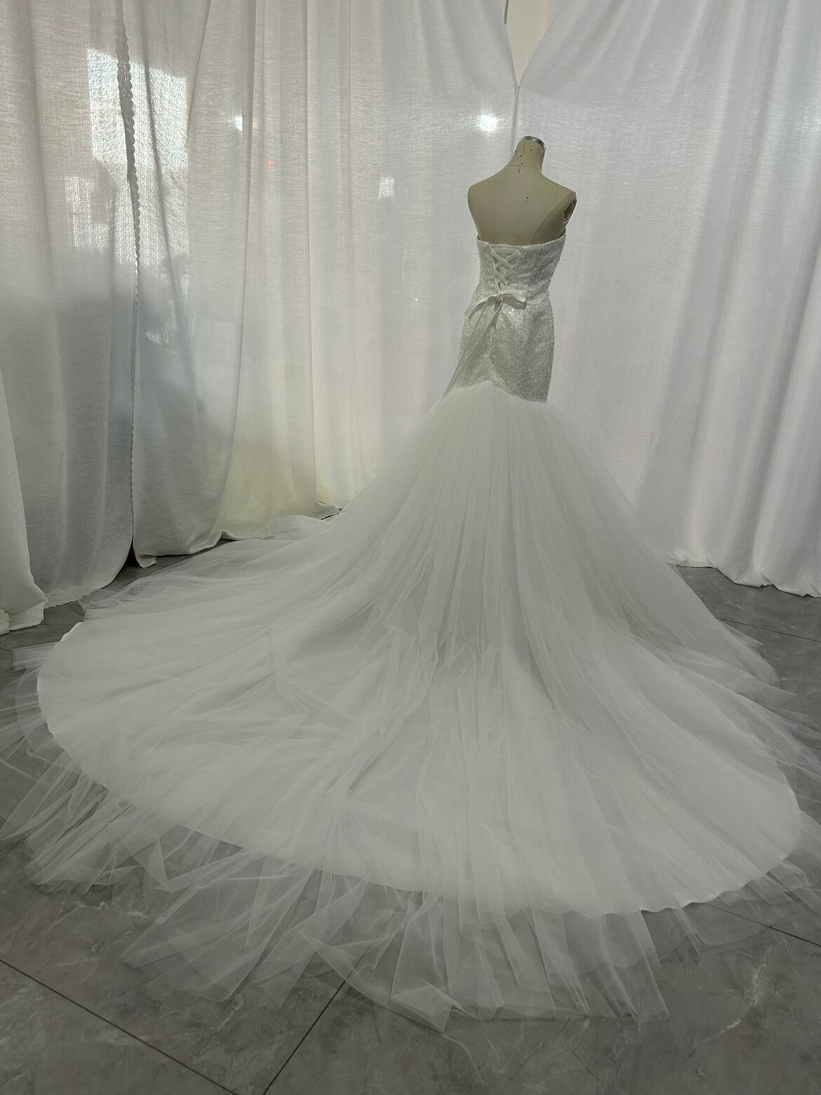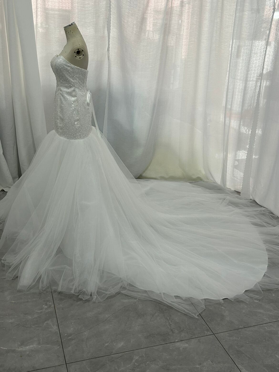 上品 ベアトップ ウエディングドレス キラキラチュール ロングトレーン マーメイドライン 2次会 前撮り 花嫁 挙式