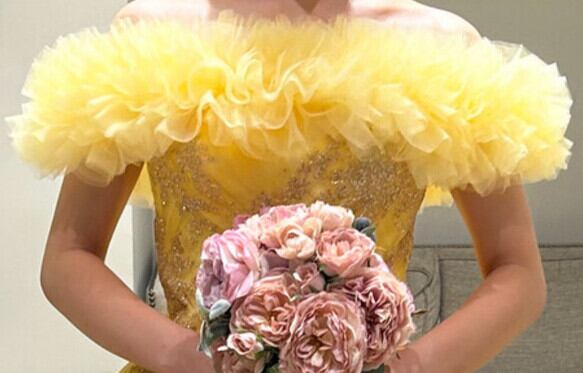 実例写真!イエロー ポンチョ ソフトチュール ラッフルフリル  取り外しオフショルダー グリー