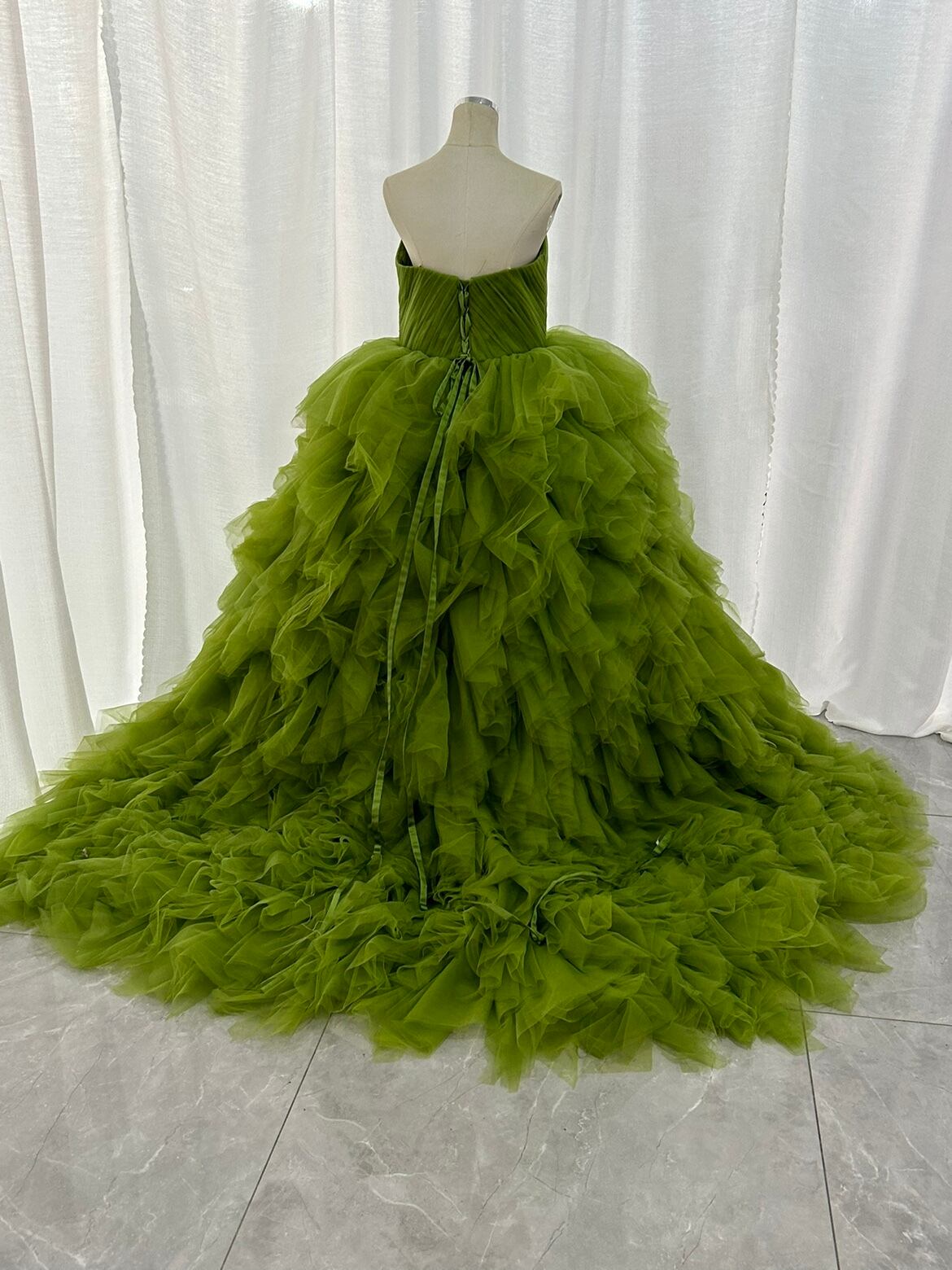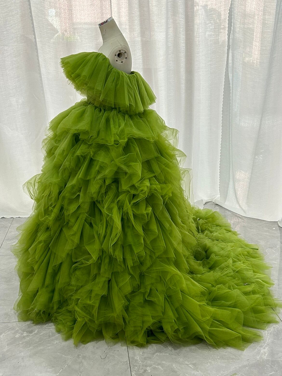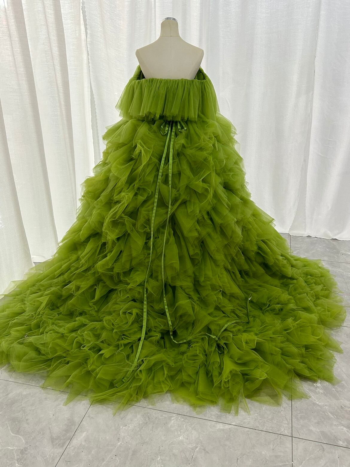 韓国風もこもこチュールドレス グリーン カラードレス フリルオフショルダー お色直し ふわふわ ボリューム
